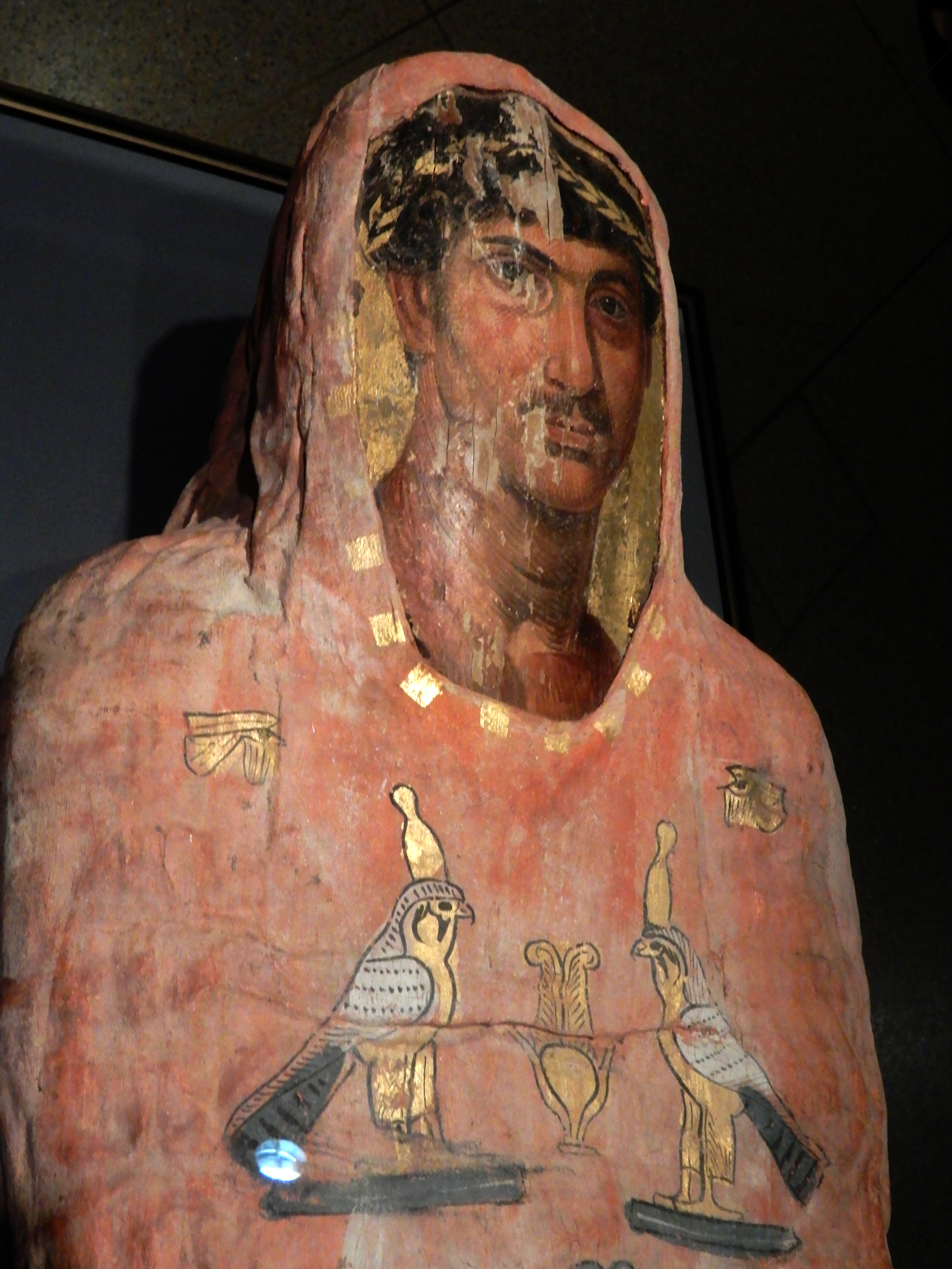 Fayum mummy portraits (named for the town where most of these were found) were painted wooden panels, which were set in the mummy wrappings as a memorial to the person buried. Most of them come from the later imperial era of the 2nd and 3rd centuries, and their style is Graeco-Roman, despite being set into Egyptian mummies. The cloth mummy wrappings themselves form a kind of framing element to the portraits, and some surviving examples have Egyptian-style decorations around them.