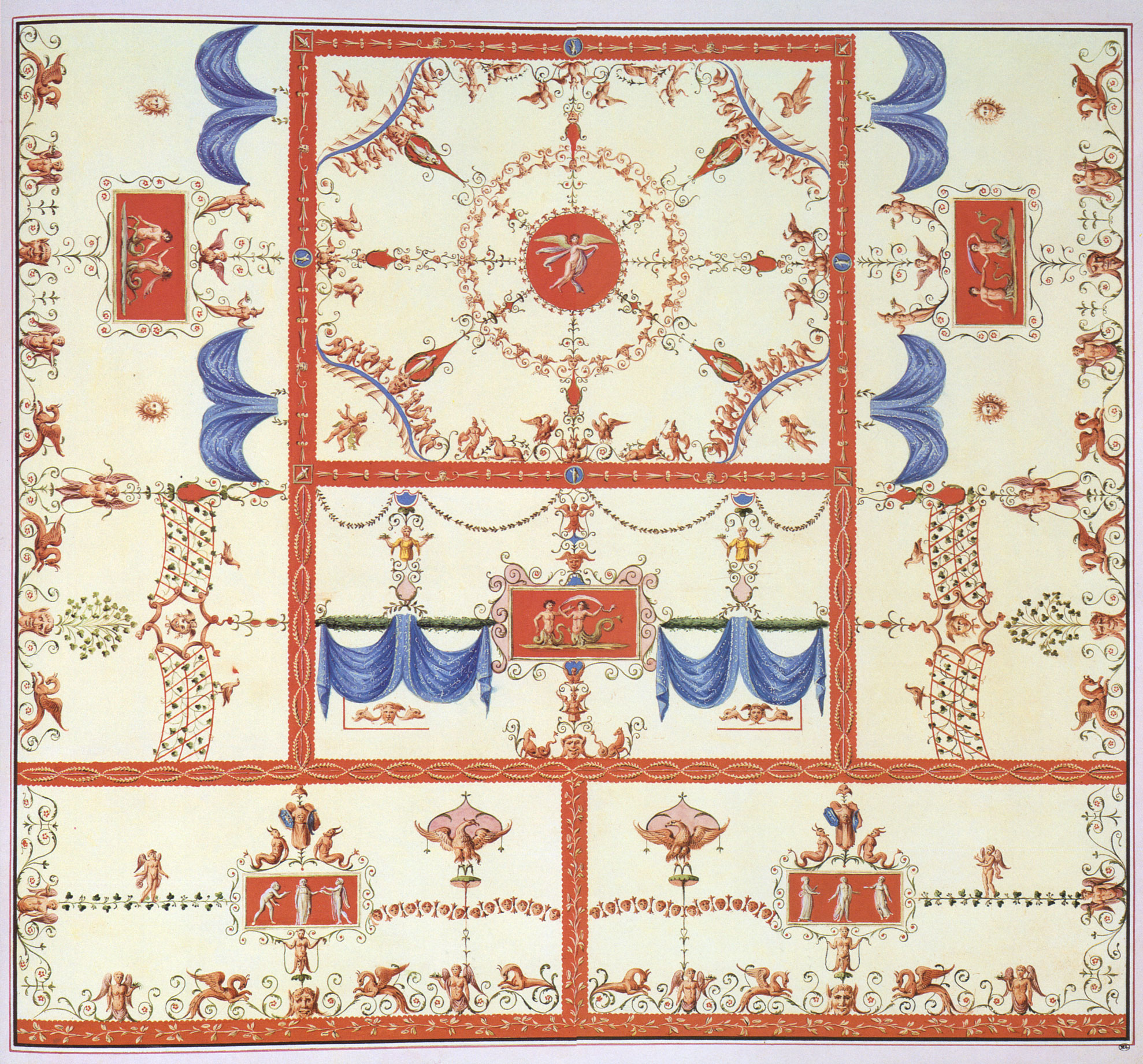 At first the palace was believed to be a grotto, as it had filled up with detritus after Nero died, and thus the early viewers were quite close to the ceilings and upper walls, which were covered with the best (‘for the emperor!’) Roman decorations to be found. What struck them was both the framing of the elements and the ornamental decorations, which became known as grottesca, from their discovery in a ‘grotta’ or cave. The frescoes today have substantially degraded from the condition they must have been in when first rediscovered; however, in 1774, three artists (an architectural draughtsman, an artist/draughtsman and an etcher and printer) were commissioned by Lodovico Mirri, who was, as well as being an artist himself, a collector, publisher and dealer, to reproduce them in the form of an album of about sixty prints, which could be sold either as black-&-white or hand-coloured folios. These must inevitably have tidied up and idealized the original Roman wall-paintings, but are the nearest reference we have now to the complete interior schemes of ornament.