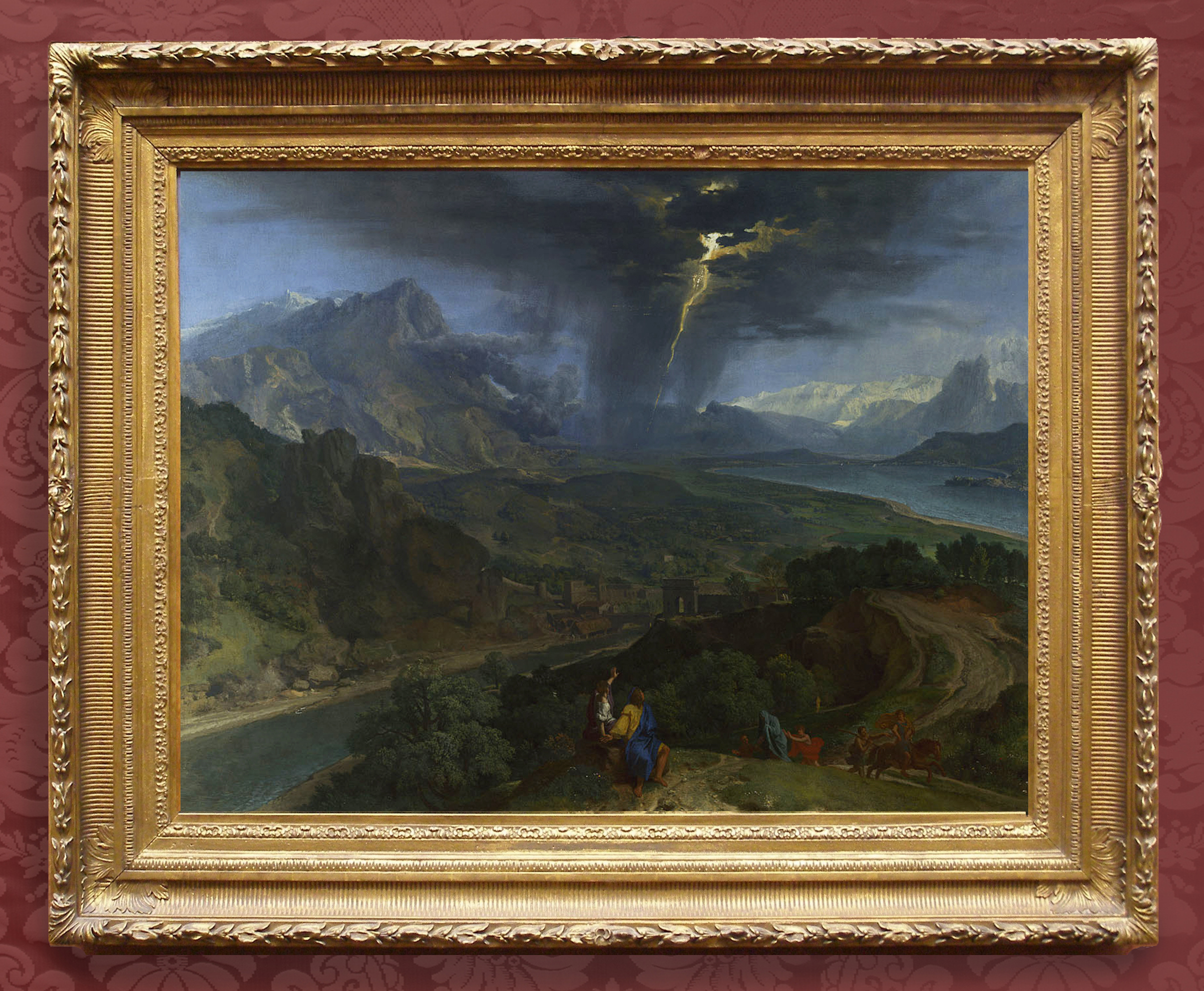 NG 5593 Francisque Millet (1642-79), Mountain landscape with lightning, c.1675, o/c, 97.3 x 127.1 cm., in previous 19th century British NeoClassical revival scotia frame (1850s-90s), with centred bunched bay leaf-&-berry torus, fluted scotia with layered acanthus leaf corners; stopped channel fluting in cavetto; acanthus leaf-&-C-scroll sight edge; inlay
