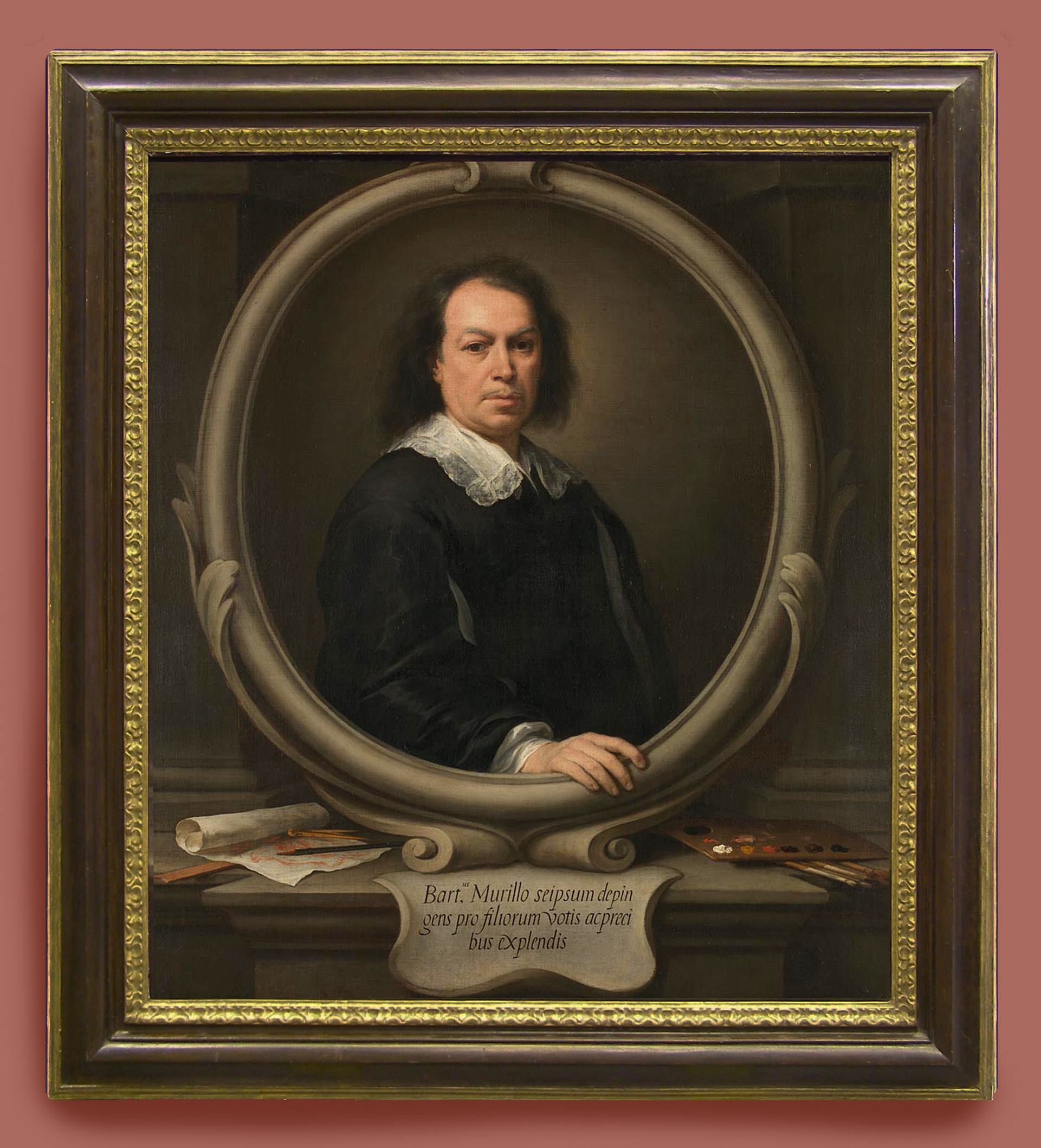 NG 6153 Murillo (1617-82), Self Portrait, c.1670, o/c, 122 x 107 cm., in previous 18th century British ‘Hogarth’ style frame, with a bolection profile in stained and polished wood; with gilded moulding at the back edge, and stylized gilded acanthus leaf tip at the sight edge; probably framed like this after the acquisition of the painting from Althorp House in 1953