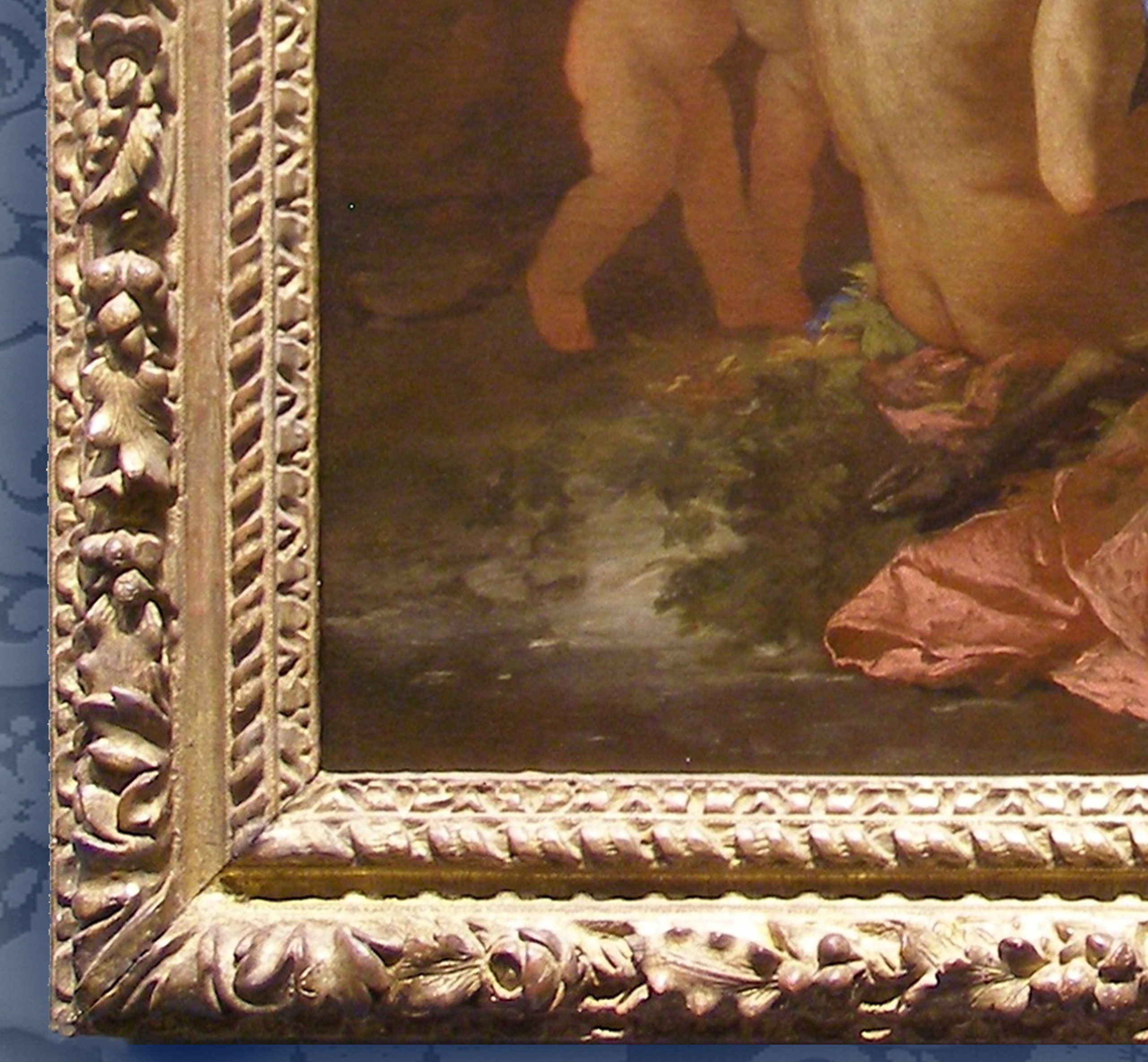 NG 39 Poussin, The Nurture of Bacchus, and detail; reframed in 17th century French Baroque Louis XIII garland frame, with torus profile; flowered back edge; rose-centred torus carved with bunched rose leaves & roses à tiges, oak leaves & acorns, and bay leaves & berries, with roses at the ends of the long sides and acanthus corners; double spiral ribbon; leaf tip sight edge; water-gilded