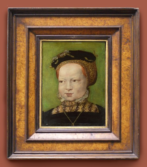 NG 4206 Jakob Seisenegger (1504/05-67), Portrait of a girl, c.1545-50, o/panel, 28.9 x 21.6 cm., in previous 20th century reproduction German cabinetmaker’s frame (probably c.1920s but Victorian in structure and finish), with entablature profile; frieze and smaller inner canted frieze, veneered in burr walnut; separating astragal, complex top and sight mouldings, all in stained and polished wood; gilt inlay