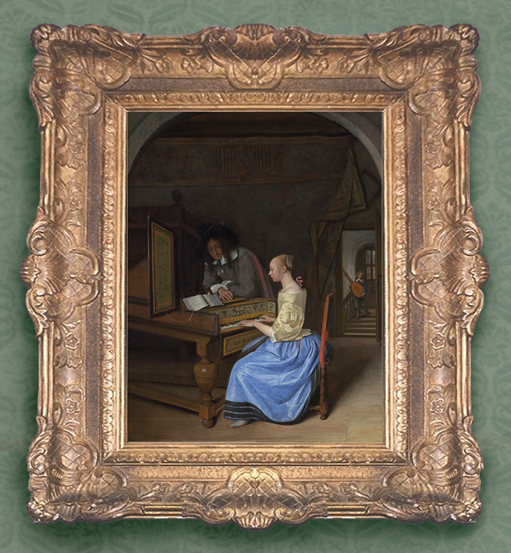 NG 856 Steen (1626-79), A young woman playing a harpsichord to a young man, c.1659, o/panel, 42.3 x 33 cm., in previous British 20th century reproduction Louis XV-style frame, with straight sides; projecting C-scroll, foliate and fanned lambrequin corners with a diapered ground; strapwork, foliate and shell centres on a diapered ground; scotia with very low relief flowered sprigs; sanded frieze; acanthus tip sight edge