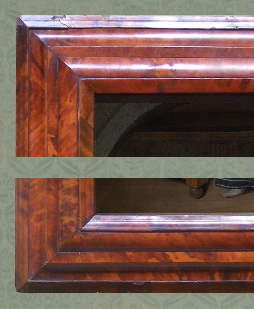 NG 856 Steen, A young woman playing a harpsichord…, and details; reframed in a 17th century Netherlandish bolection frame, and details; veneered in tortoiseshell; with a stepped, convex and canted profile