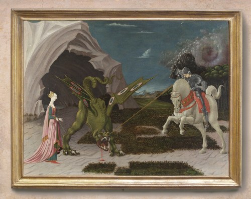 NG 6294 Uccello (c.1397-1475), St George and the dragon, and detail; reframed in 16th century cassetta (either Spanish or Italian); entablature profile; water-gilded