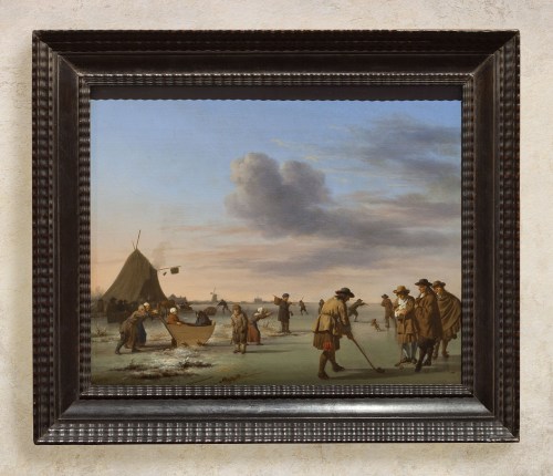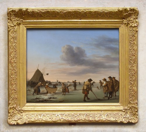 NG 869 Van de Velde (1636-72), Golfers on the ice near Haarlem, 1668, o/panel, 30.3 x 36.4 cm., in previous mid-20th century pastiche Louis XIV-style reproduction compo frame of poor quality, applied in the early 1960s; with a shallow concave profile; with low relief fanned lambrequin & scrolling foliate corners, joined by strapwork, acanthus leaf & leaf-bud running ornament on a pseudo cross-hatched ground, and stepped mouldings to the sight edge; gilded overall with schlagmetal
