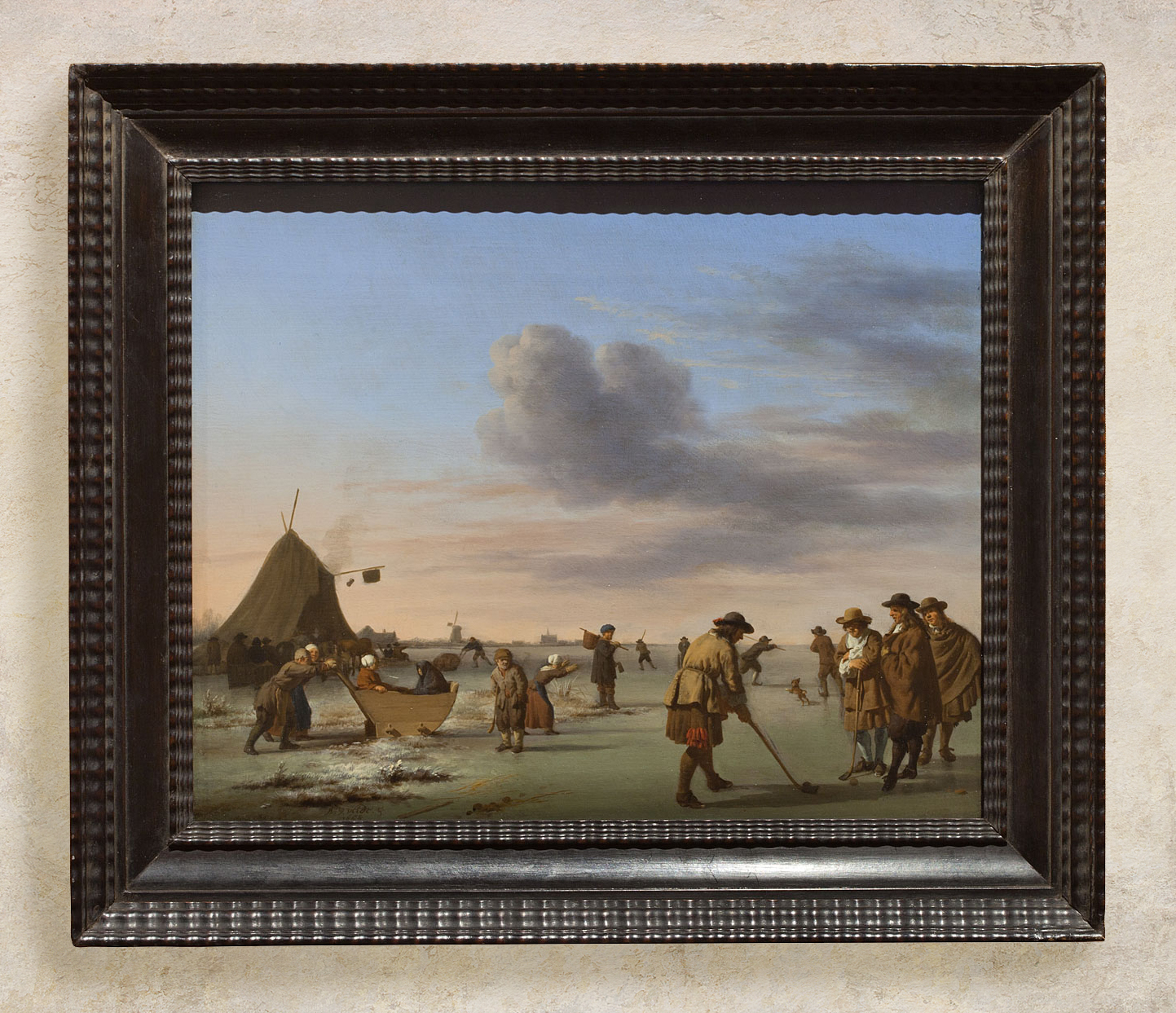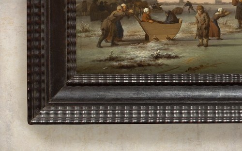 NG 869 Van de Velde, Golfers on the ice near Haarlem, reframed in 18th century Netherlandish frame with concave profile, veneered in ebony; with a wide band of ripple moulding at top edge, and narrow ripple moulding at sight edge