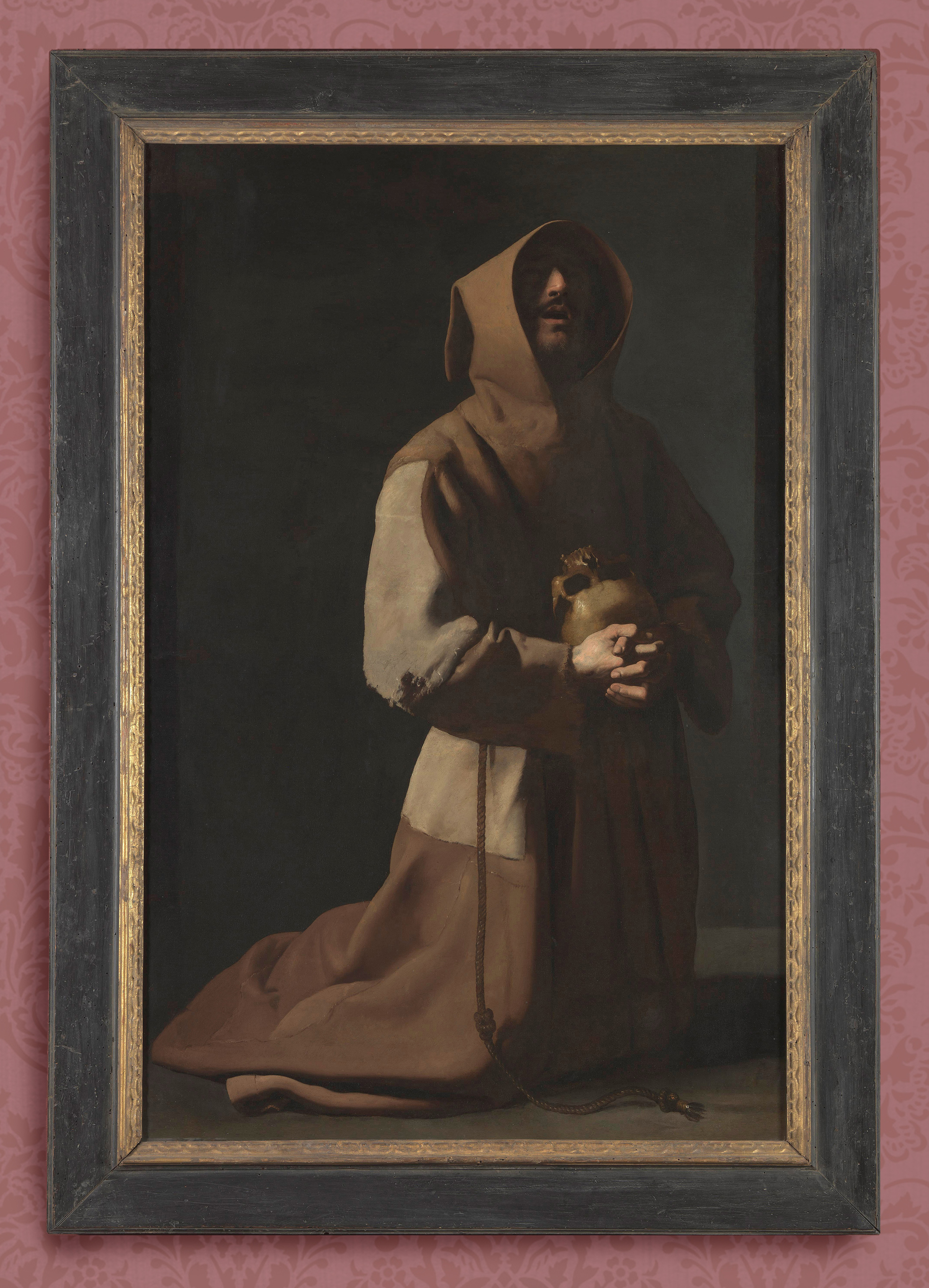 NG 230 Francisco de Zurbarán, St Francis in meditation, reframed in restored 17th century Spanish reverse architrave frame; ebonized frieze, with carved giltwood stylized leaf-tip moulding at sight edge