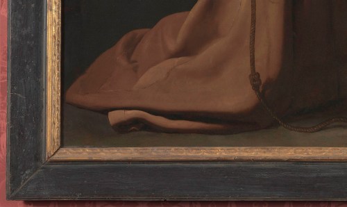 NG 230 Francisco de Zurbarán (1598-1664), St Francis in meditation, 1635-39, o/c, 152 x 99 cm., in previous 17th century Italian cassetta, architrave with convex & ogee top and sight mouldings, made of poplar and grained as faux walnut with mordant-gilded corner & centre scrolling foliate-&-flower bud panels, with florets at demi-centres