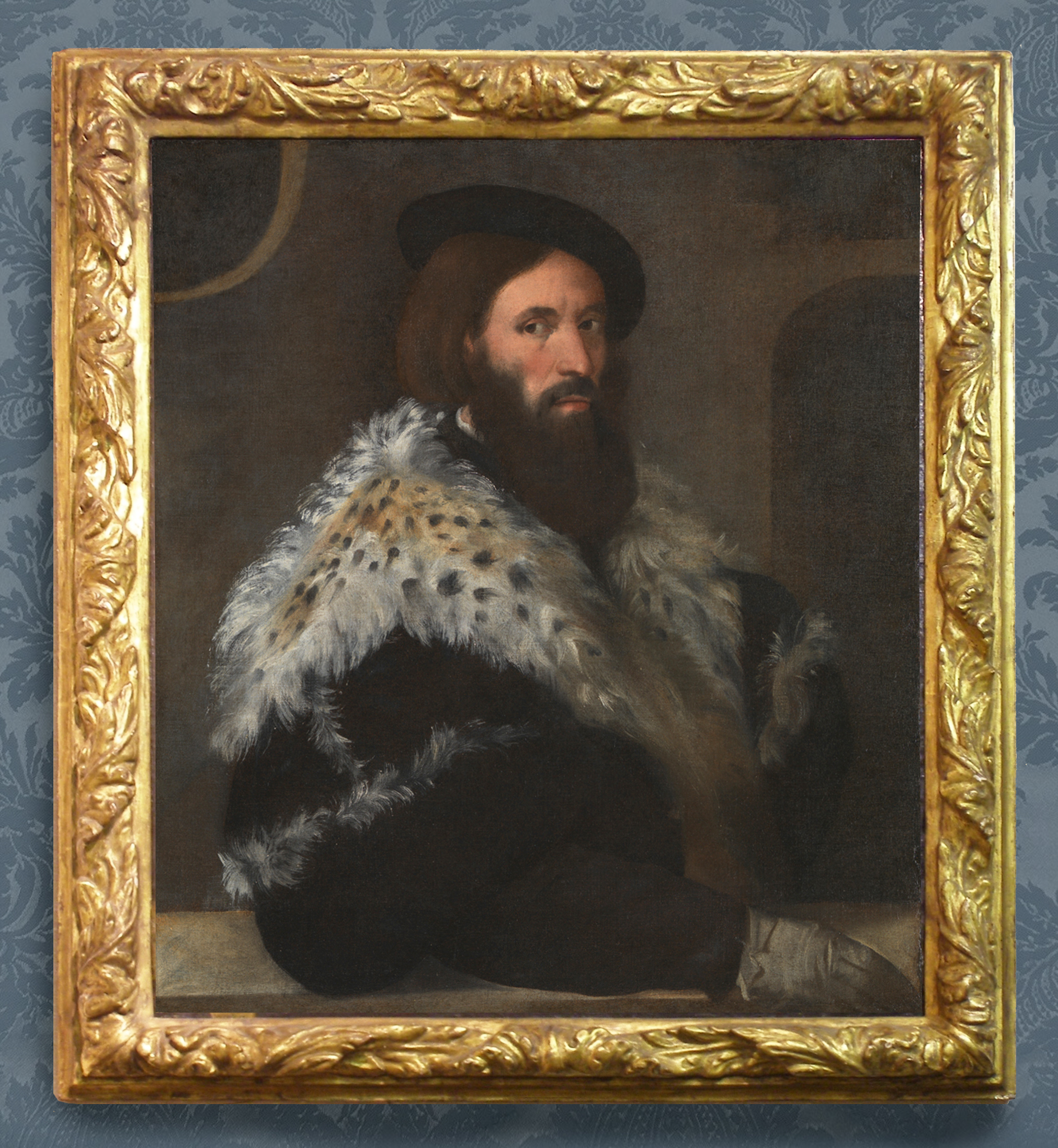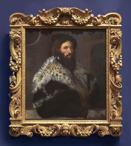 NG3949 Titian (attrib.; fl.1506-d.1576), Portrait of a man (Girolamo Fracastoro?), c.1528, o/c, 84 x 73.5 cm., in previous Italian Baroque bolection torus frame, with cavetto at back edge, the torus carved overall with spiralling acanthus leaves centred with stylized acanthus leaf clasps, and with leaf corners; probably first third 17th century; regilded