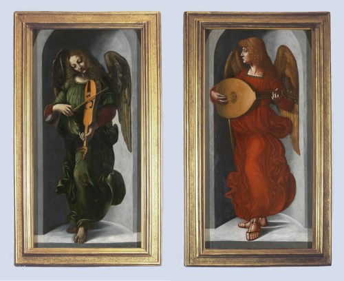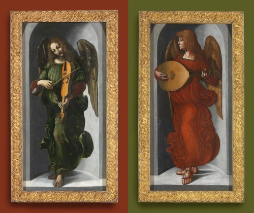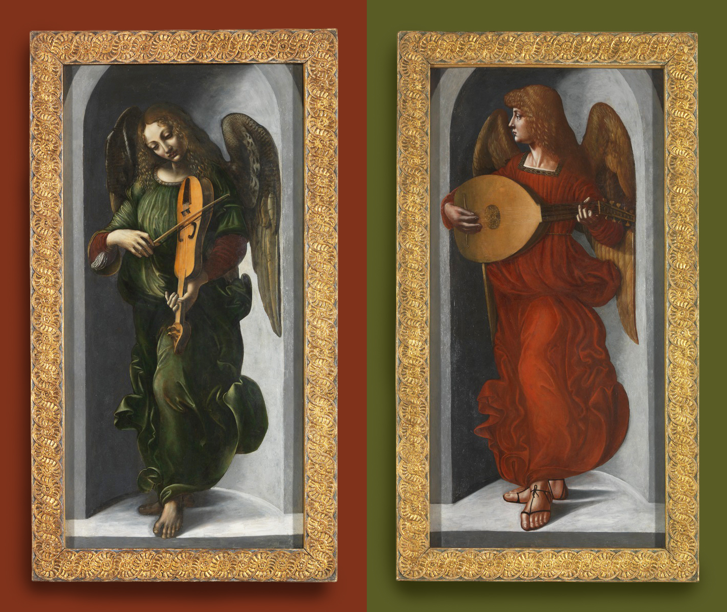 NG 1661 Leonardo da Vinci (associate of; 1452-1519), An angel in green with a vielle, c.1490-99, o/panel, 117.2 x 60.8 cm., and NG 1662 Giovanni Ambrogio de Predis (c.1455-1510), An angel in red with a lute, both from the San Francesco Altarpiece, Milan, c.1495-99, o/panel, 118.8 x 61 cm.; both in the previous 20th century frames, constructed after 1931 in the style of a Renaissance cassetta; both made from antique mouldings with new sight edges; the original polychrome finish of the antique sections (black and red paint on gesso ground) concealed beneath sanding on the frieze and an overall gilded finish.
