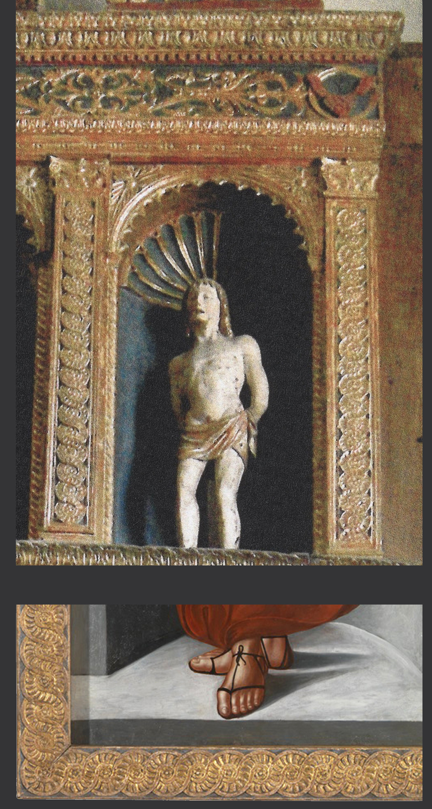 Top, detail of the guilloche on the upper tier of the altarpiece in Ponte in Valtellina; bottom, detail of the guilloche frame of the Angel in red