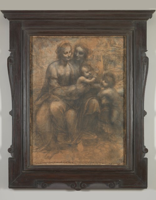 NG 6337 Leonardo (1452-1519), The Virgin and Child with St Anne and the infant John the Baptist (‘The Burlington House Cartoon’), c.1499-1500, charcoal and white chalk on paper, mounted on canvas, 141.5 x 104.6 cm., in previous frame: a giltwood ogee moulding carved with cross-cut stylized lotus leaves with a top fillet, made c.1964/65 and used for the cartoon from then until 1991, and then again from 2002 or earlier until 2011