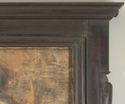 NG 6337 Leonardo cartoon and detail, reframed in replica Tuscan Mannerist carved walnut tabernacle frame, in the style of the third quarter of the 16th century, reflecting the display of Renaissance drawings at a that period in trompe l’oeil borders; with bolection profile and wide frieze; outset corners, the single straight contour at the top supporting undecorated cornice; the inset lateral rails with S-scrolled supporting brackets with central half-round motif on a fillet; the inset bottom rail with a double C-scrolled apron; stained & polished