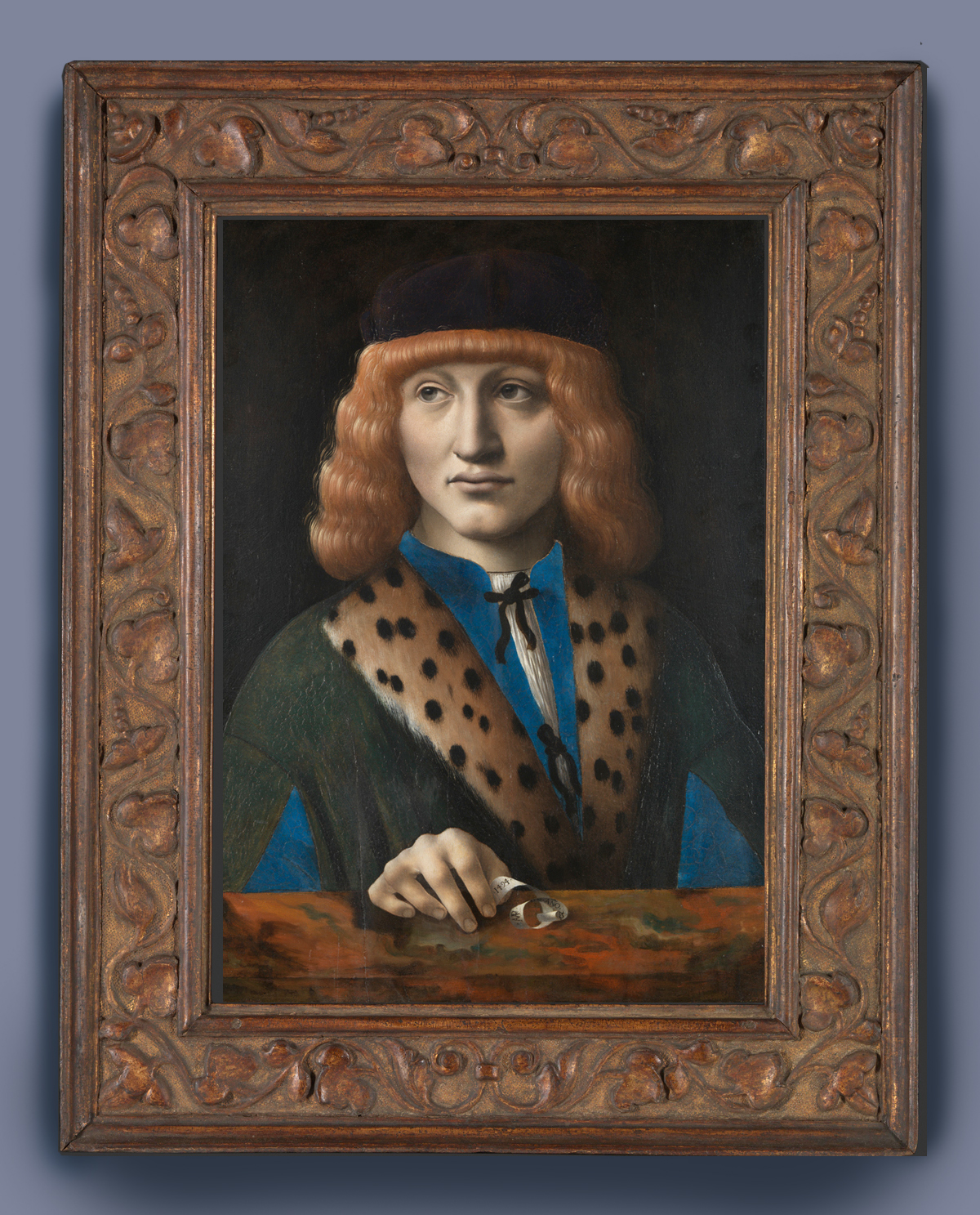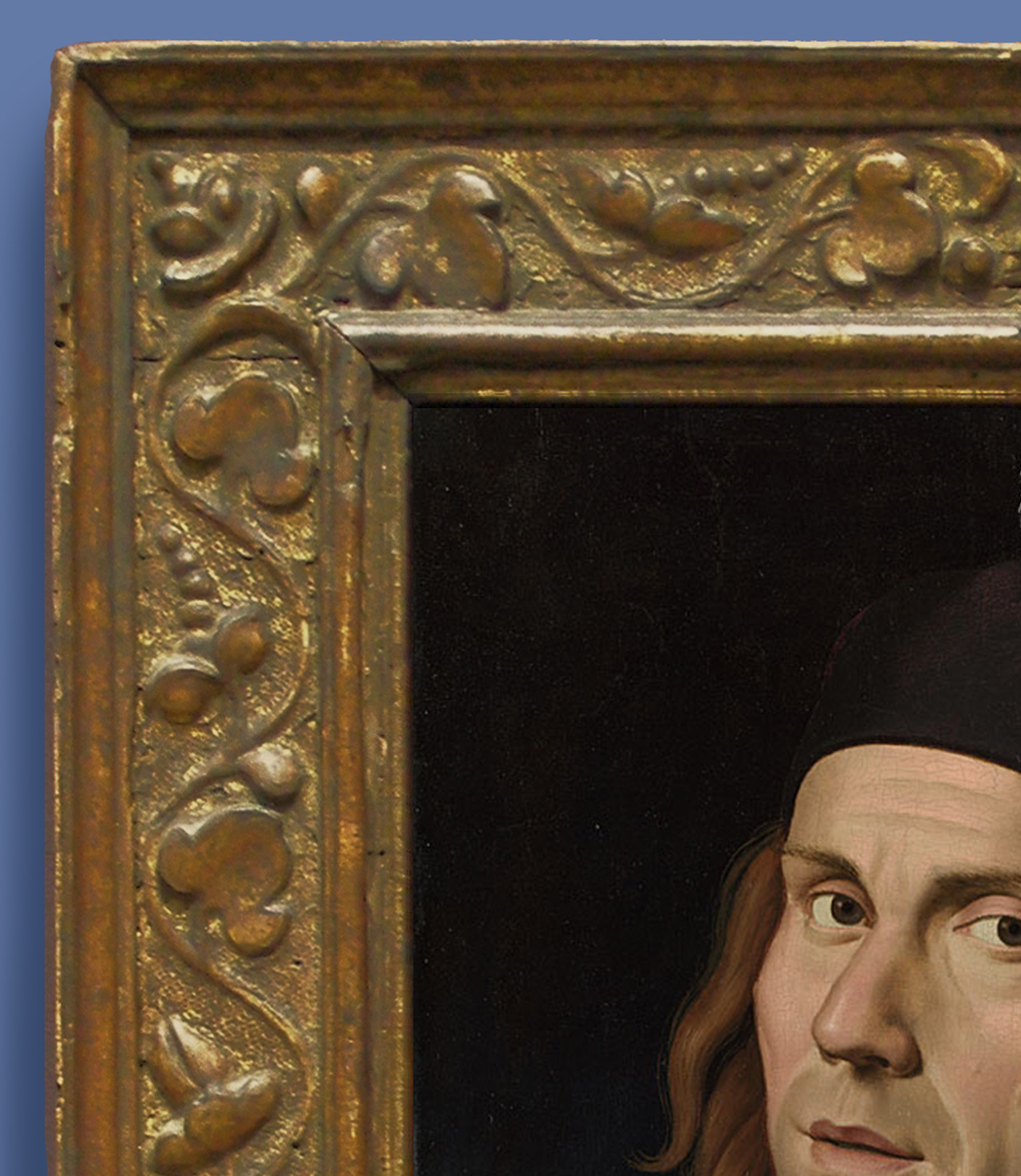 NG 1665 Marco d’Oggiono, Portrait of a man aged 20, reframed in a replica 16th century Italian-style carved wooden cassetta, with an architrave profile; the frieze carved with continuous low-relief undulating vine of ivy-like leaves & flowers, with flower corners, centred at top and bottom with paired bound volutes, all on a punched ground; gilded a dark red gold & patinated