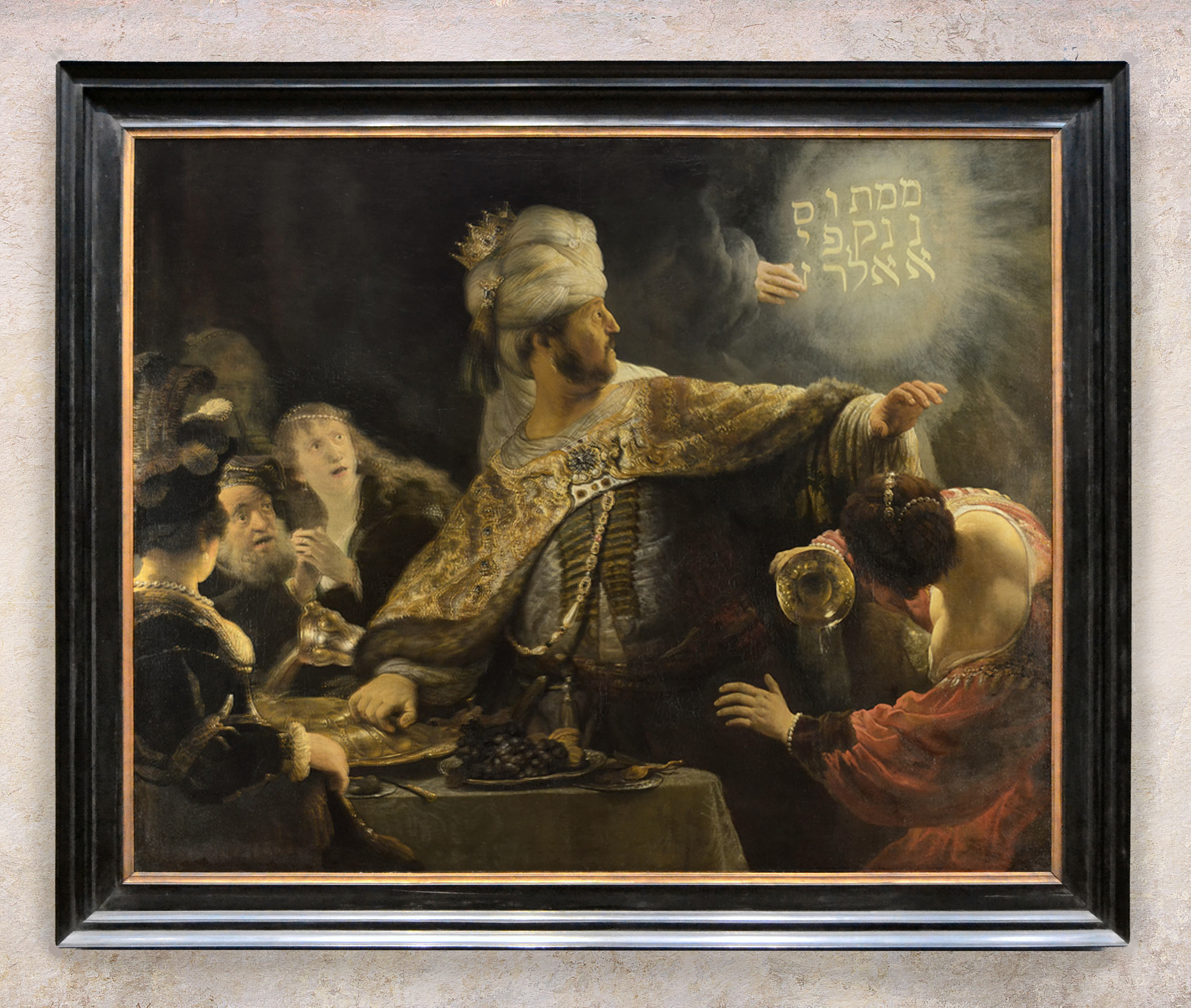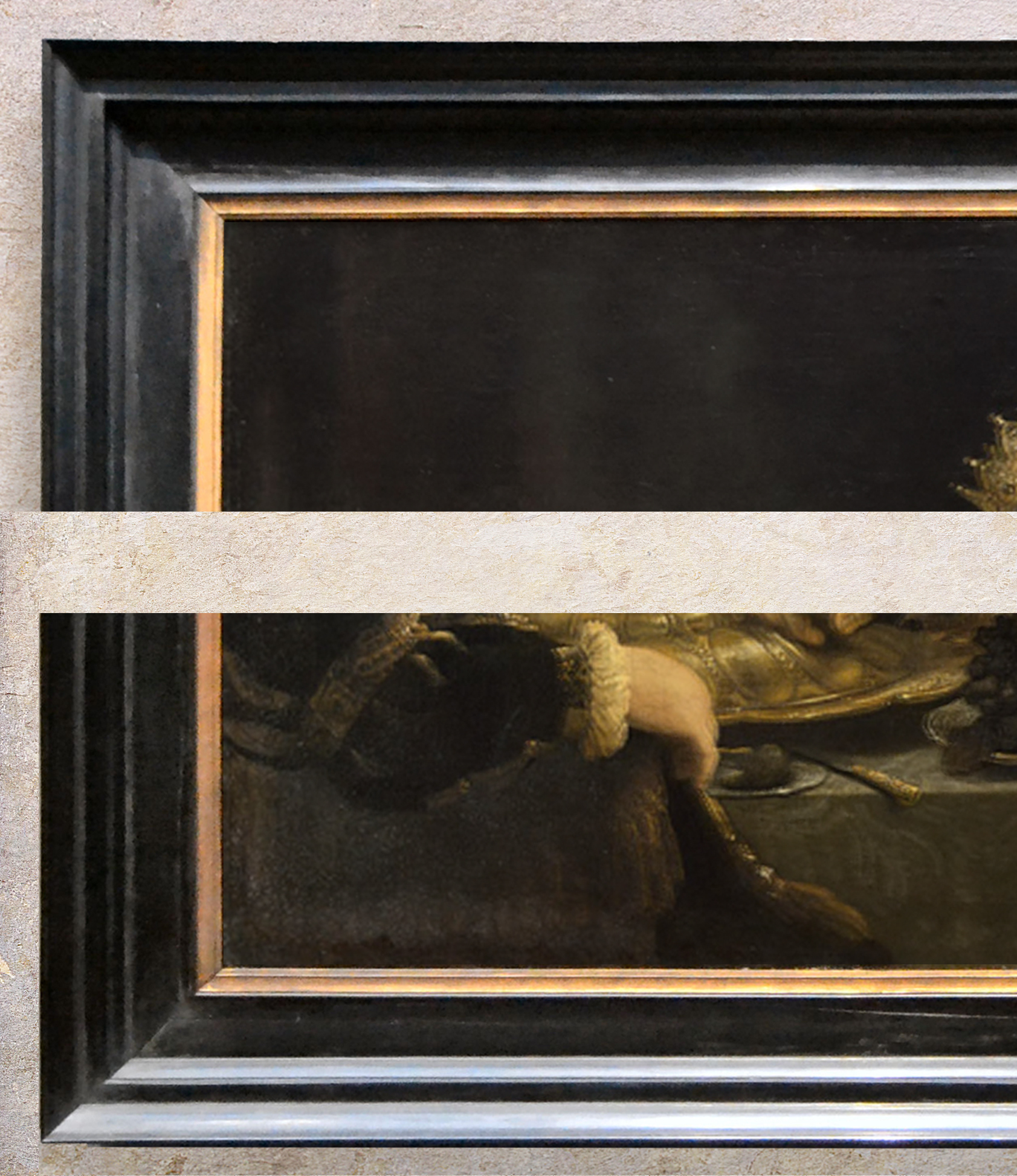 NG 6350 Rembrandt, Belshazzar’s Feast, and details; reframed in a replica of a 17th century Netherlandish ebony cabinetmaker’s frame, with entablature profile and wide frieze, veneered with polished ebony on a wooden carcase with gilded sight edge