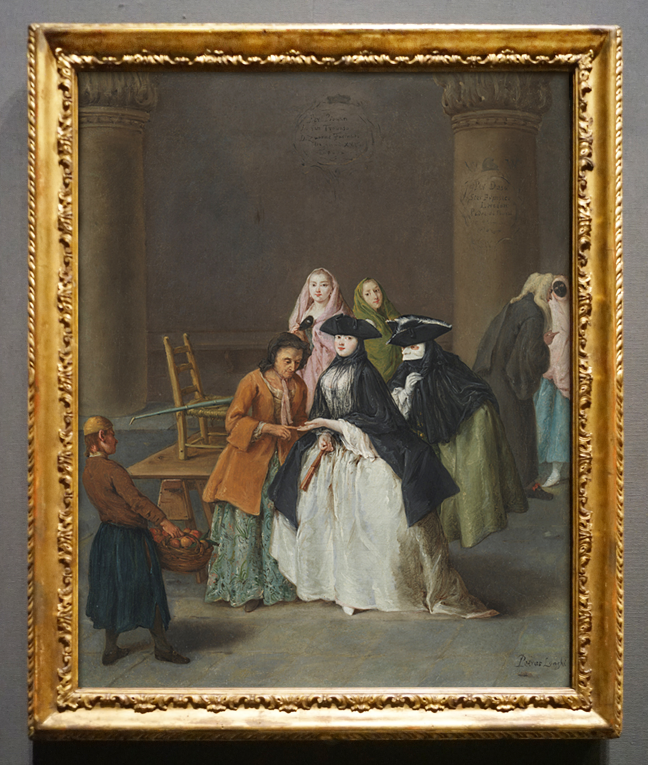 NG 1334 Pietro Longhi (1701-85), A fortune teller in Venice, c.1756, o/c, 59.1 x 48.6 cm., original antique carved giltwood ‘Longhi’ frame and detail