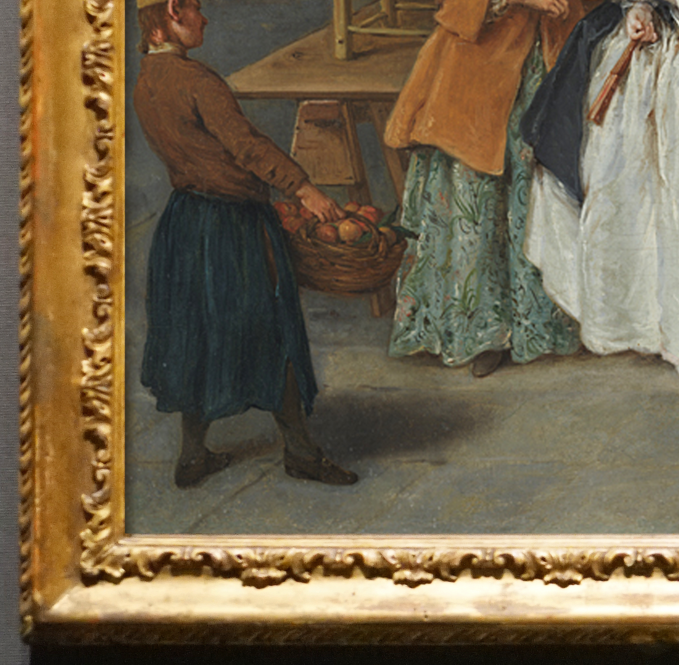 However, we are justified in linking this type of frame with Longhi, since two of his paintings are in their original frames, and, furthermore, we can identify an identical frame in the background of A nobleman kissing a lady’s hand (NG 5852). Longhi painted many Venetian scenes of this size and when we acquired two ‘Longhi’ frames we found that they were an exact fit for two of the Gallery’s paintings.
