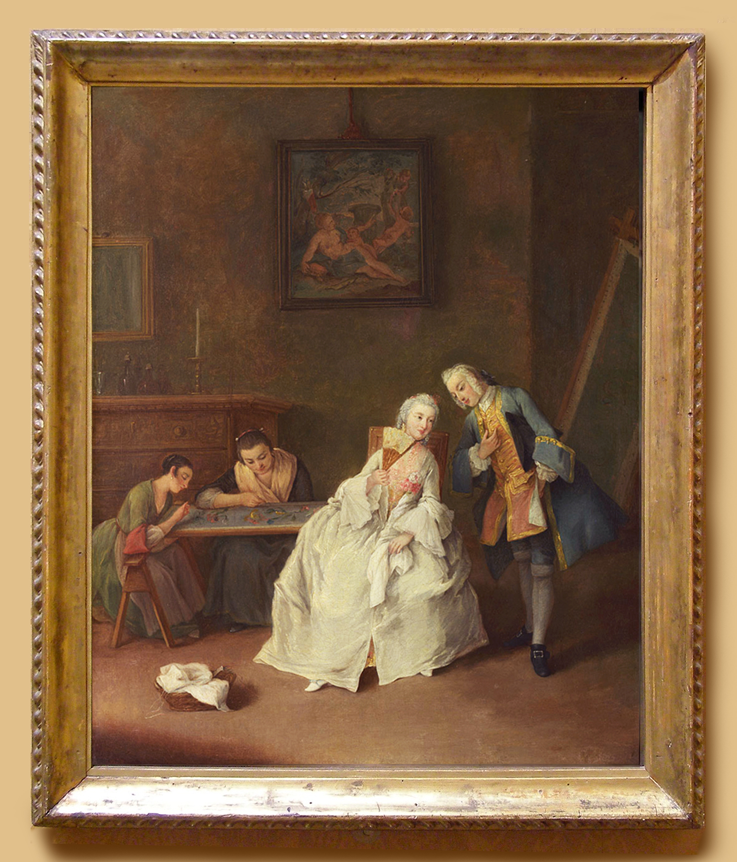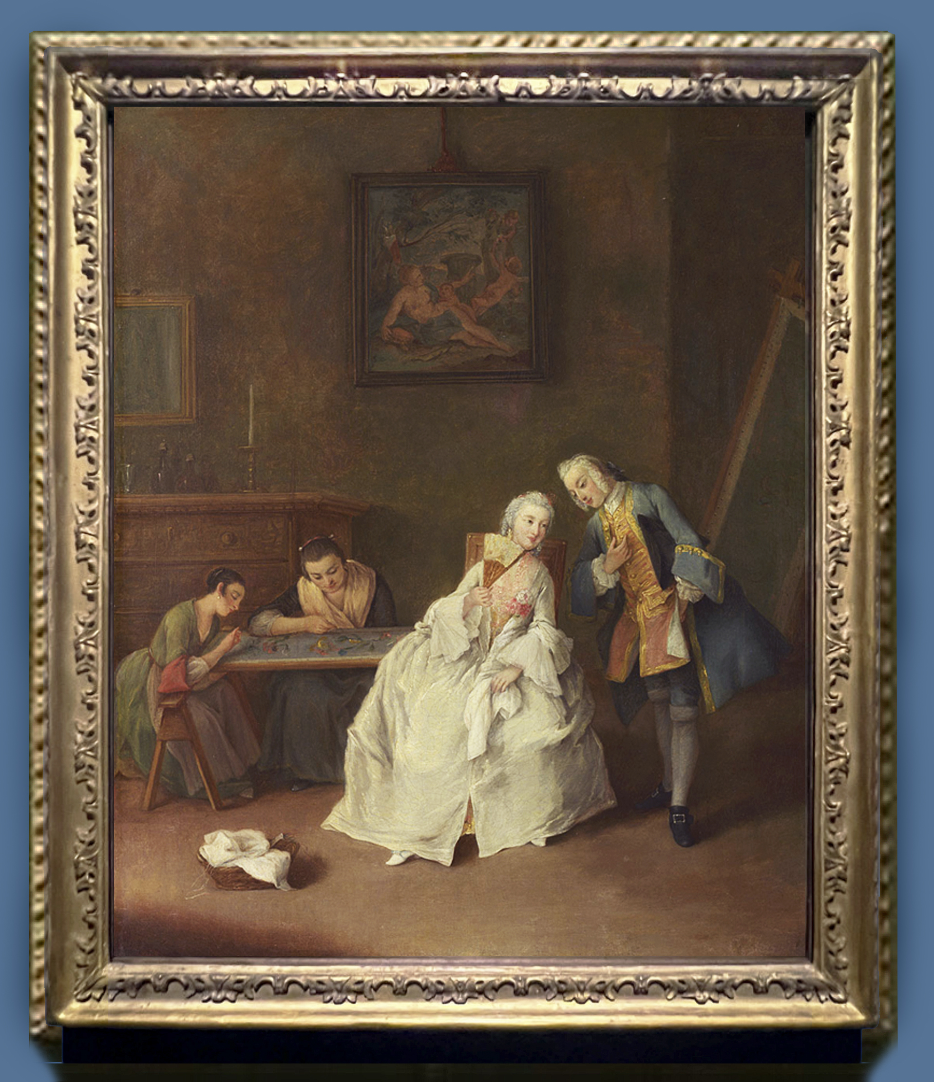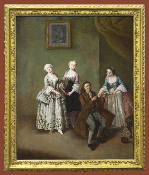 NG 1100 Pietro Longhi (1701-85), An interior with three women and a seated man, c.1750-55, o/c, 61.3 x 49.7 cm., now rehoused in antique carved giltwood ‘Longhi’ frame, and detail