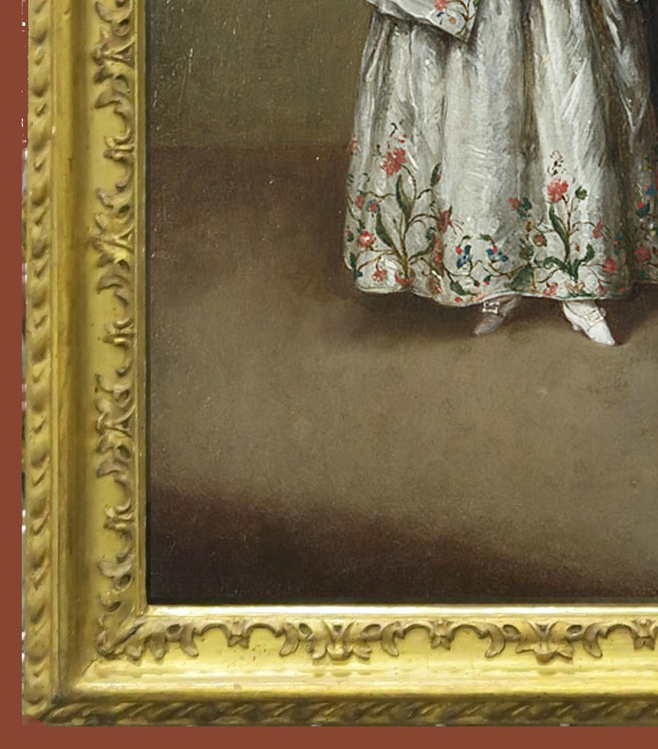 NG 5852 Pietro Longhi (1701-85), A nobleman kissing a lady’s hand, c.1746, o/c, 61.3 x 49.5 cm., original antique carved giltwood ‘Longhi’ frame, detail of painted frame in background, and detail of carved frame
