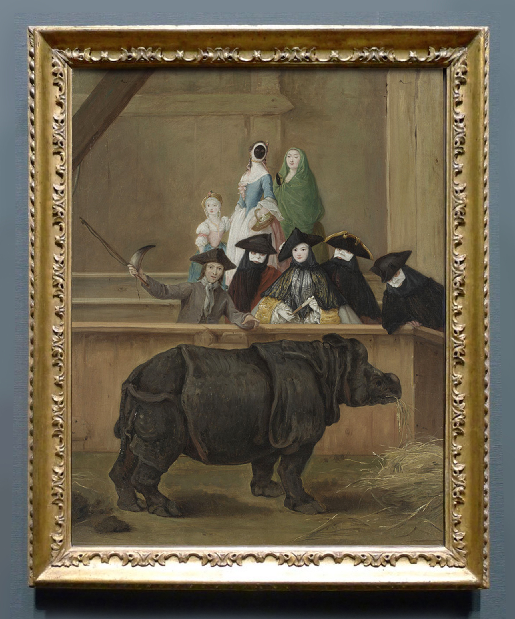 NG 1101 Pietro Longhi (1701-85), Exhibition of a rhinoceros in Venice, c.1751, o/c, 60.4 x 47 cm., in the newly restored ‘Longhi’ frame, and details