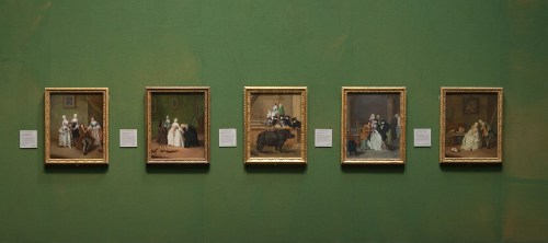 Pietro Longhi’s five paintings of Venetian genre scenes hanging together in the Gallery; from left to right: An interior with three women and a seated man (NG 1100), A nobleman kissing a lady’s hand (NG 5852), Exhibition of a rhinoceros in Venice (NG 1101), A fortune teller in Venice (NG 1334), and A lady receiving a cavalier (NG 5841).