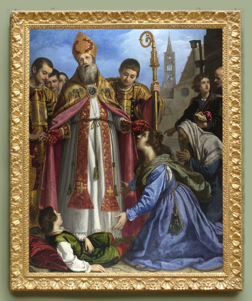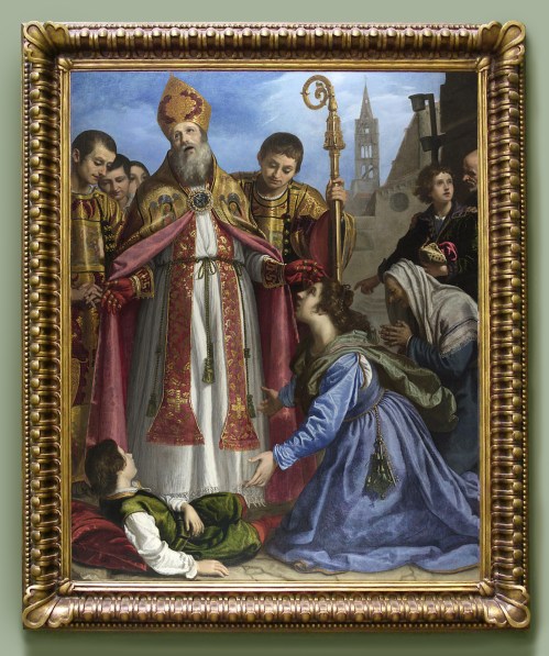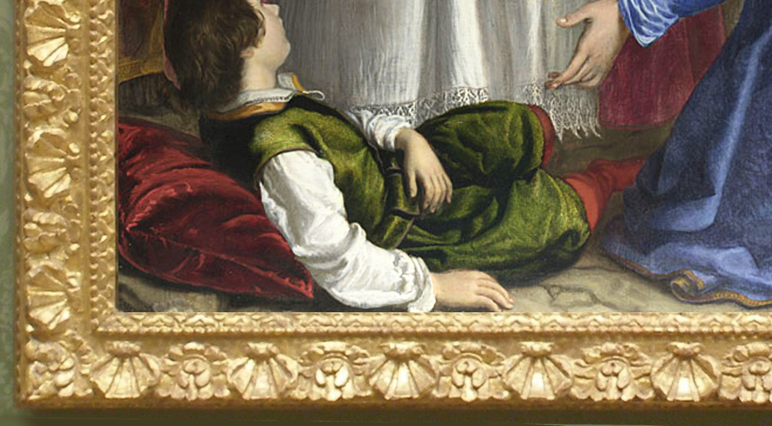 The style of the previous frame was too late for the painting, and noticeably too mean and narrow to do justice to its style and composition. The ‘Sansovino’ frame which replaces it is a virtuoso, theatrical production, perfectly matched to the magnificent presence of the portrait itself. The sitter is now set back in the space behind the sill of what has become a great sculptural window frame, decorated with a richness which is a complement to the small range of painted colours, and where elements of the carved ornament create surprising focal relationships with the portrait – for example, the two upper scrolls on each side echo the curves of the face, and direct the eyes towards it.