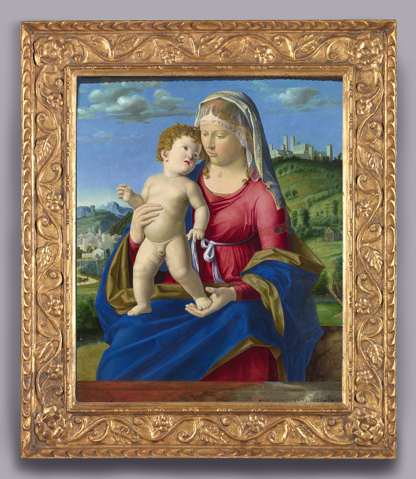 NG 300 Cima (c.1459/60-c.1517/18), The Virgin and Child, c.1496-99, o/panel, 69.2 x 57.2 cm., and detail; in previous 20th century British reproduction of a Renaissance-style cassetta with architrave profile, nocked moulding at back edge; frieze with coarse undulating vine and floret with flower corners; astragal-&-double bead; probably given to painting in 1962-64