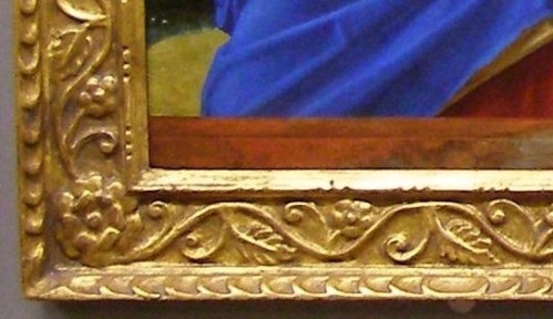 This frame was happily just the right size for the panel, and as well as also being of approximately the right period is decorated with a continuous pattern of scrolling leaves and rosettes – roses being one of the attributes of the Virgin. Altogether it has five orders of ornament, the five inner rows (beneath the sculptural egg-&-dart) being small and shallow, and imparting a flicker of light and movement around the image.