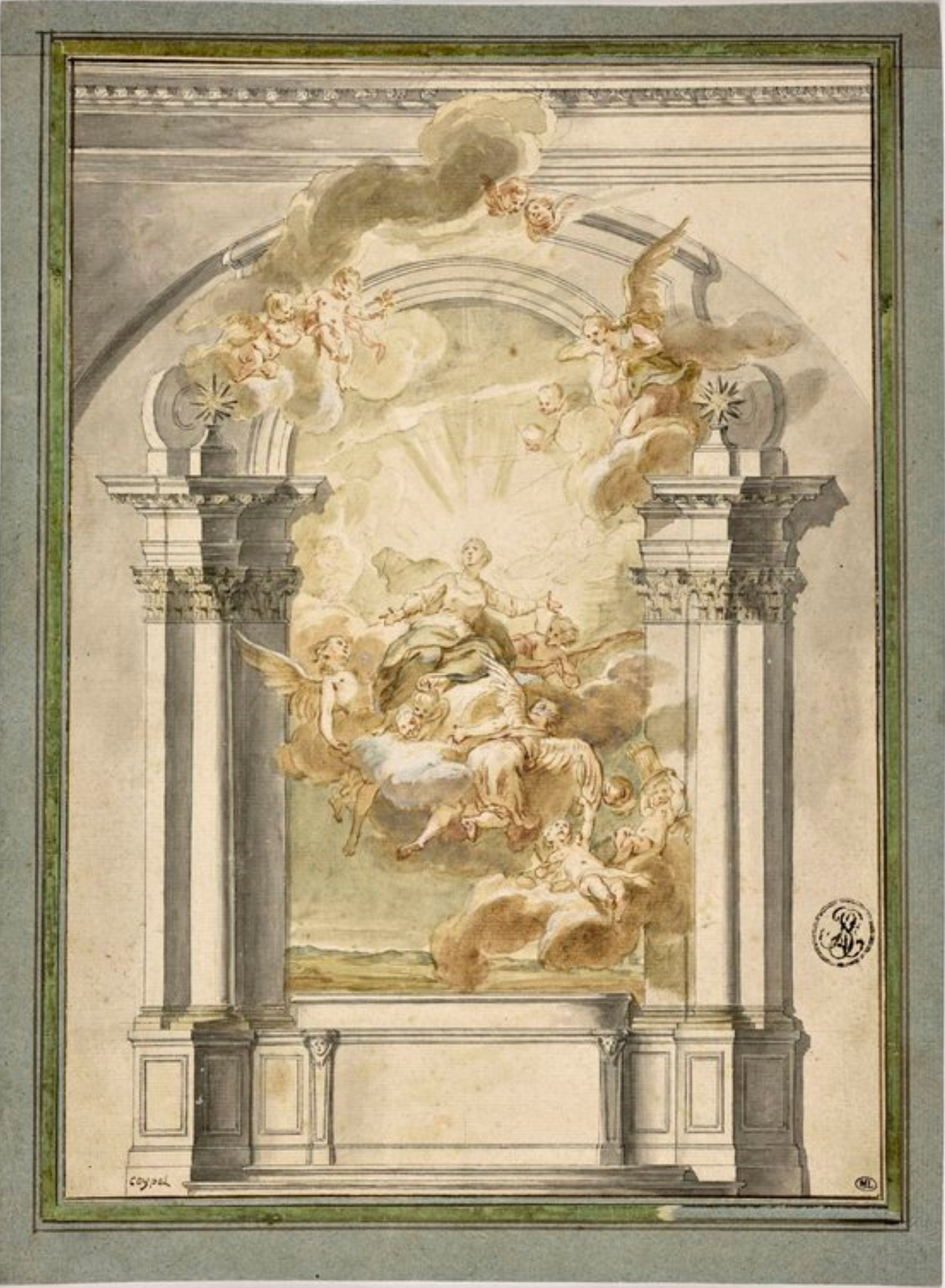 Coypel (? Noël-Nicolas, 1690-1734), design for altarpiece with The assumption of the Virgin, for the Chapel of the Virgin, St Sauveur, Paris, c. 1731, black chalk, sanguine, wash, white heightening, 31.2 x 22.2 cm., Département des Arts graphiques, Musée du Louvre