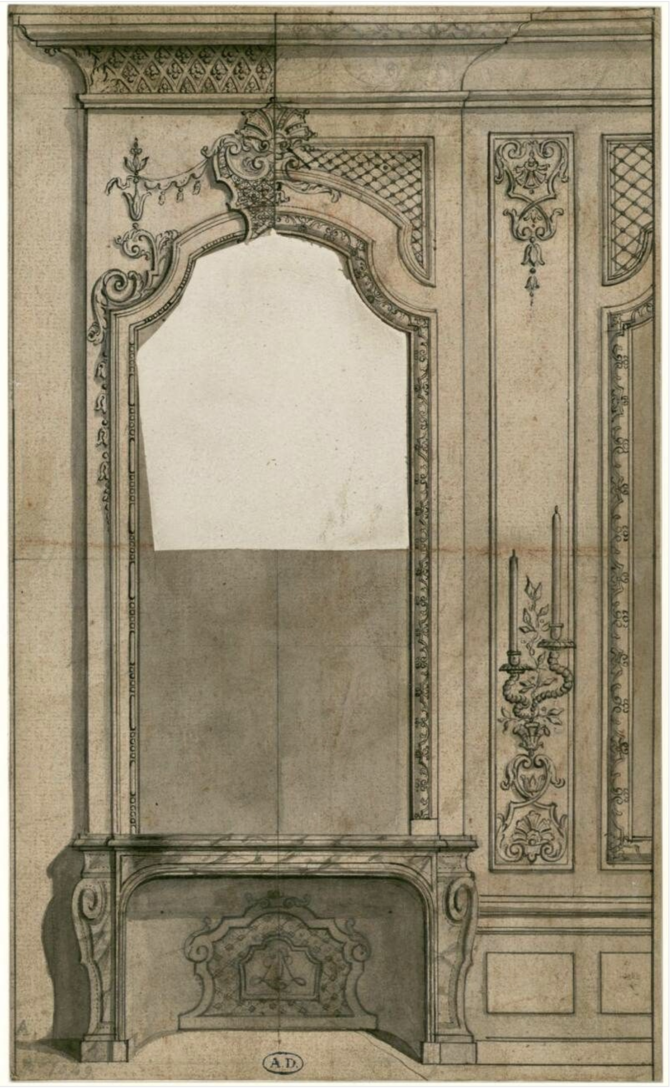 Anon., French school, design for a chimney and overmantel, 18th century, pencil, sanguine, ink, watercolour, 25 x 15.5 cm., Musée des Arts décoratifs, Paris