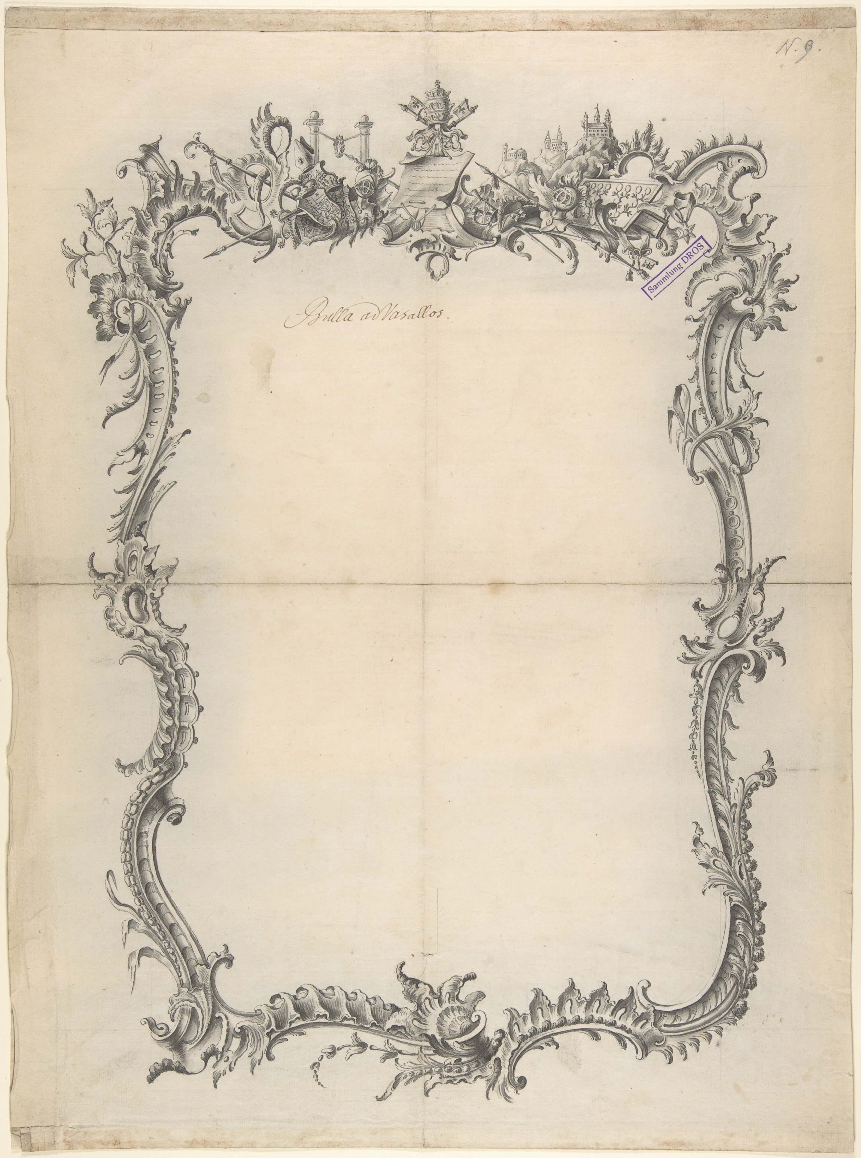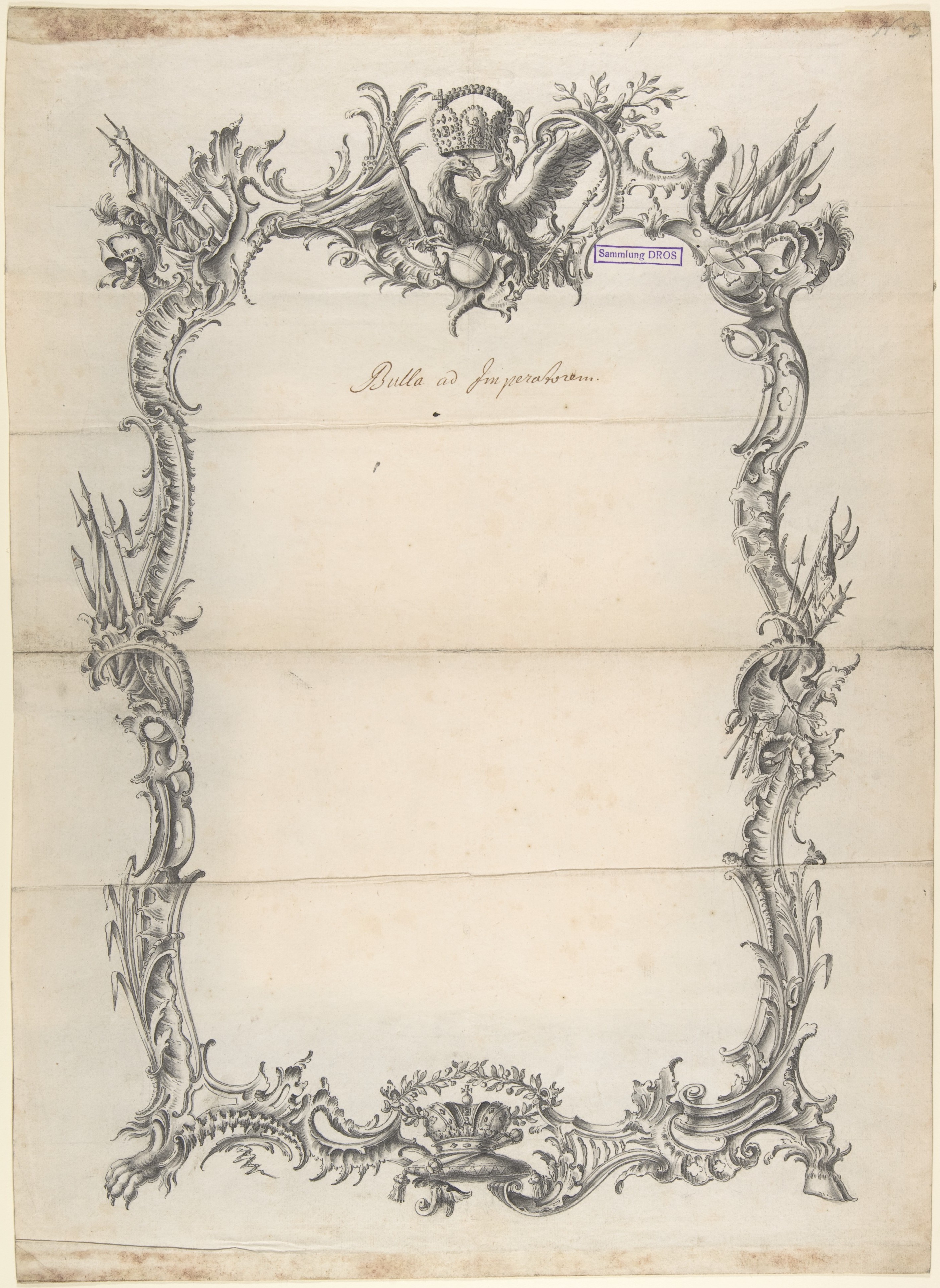 Johan Oktavien Salvert (fl. 1732-88), design for a Rococo frame with military trophies, and eagles supporting the German imperial crown at the crest, 1750-88, black chalk, ink, wash, incised, 47.1 x 34.1 cm., Metropolitan Museum, New York