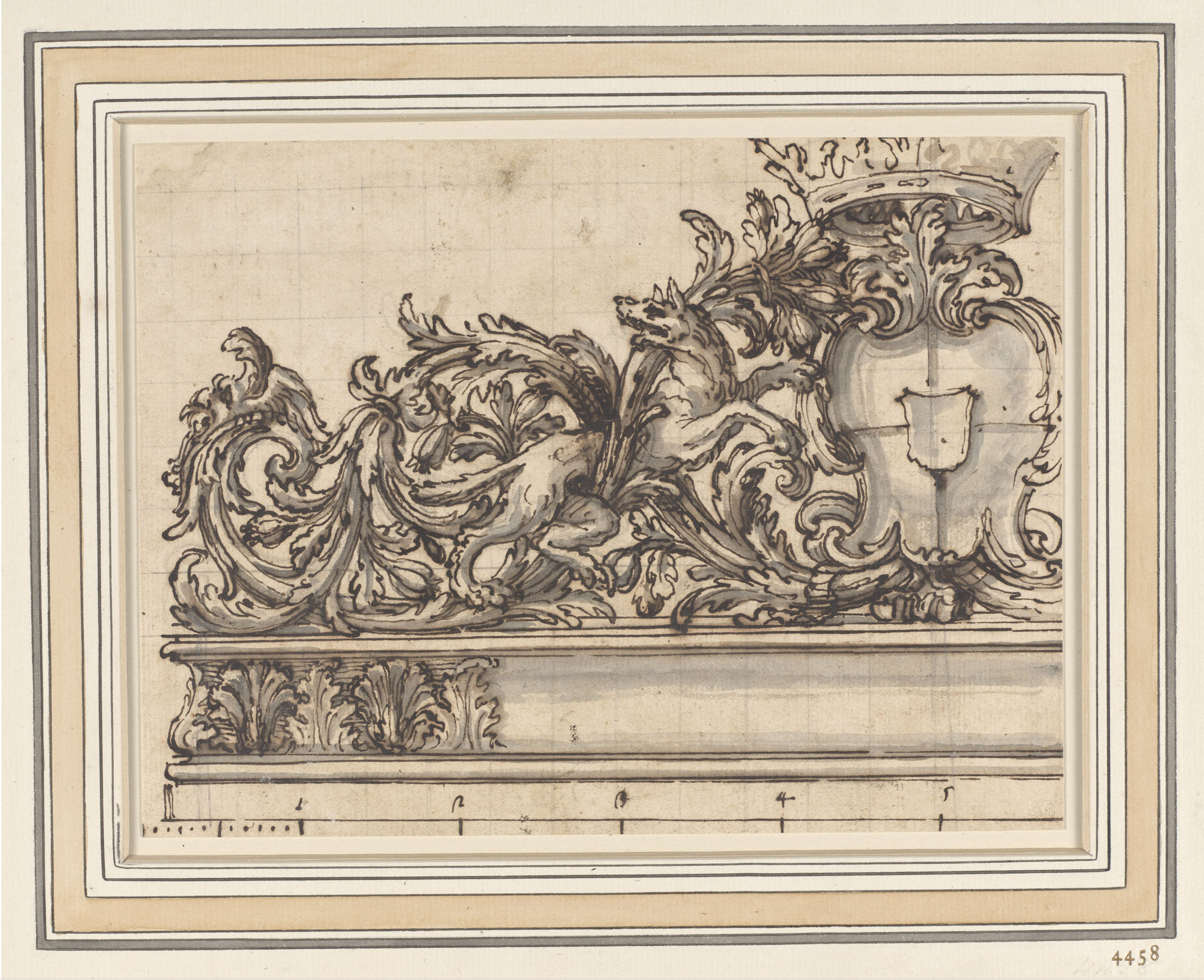 A design for the top of a frame, with a rampant dog, or wolf, entwined in acanthus leaves; with a coat of arms surmounted with a ducal coronet. Squared for enlargement; with a scale along the lower edge. See also RCIN 905578 (below).