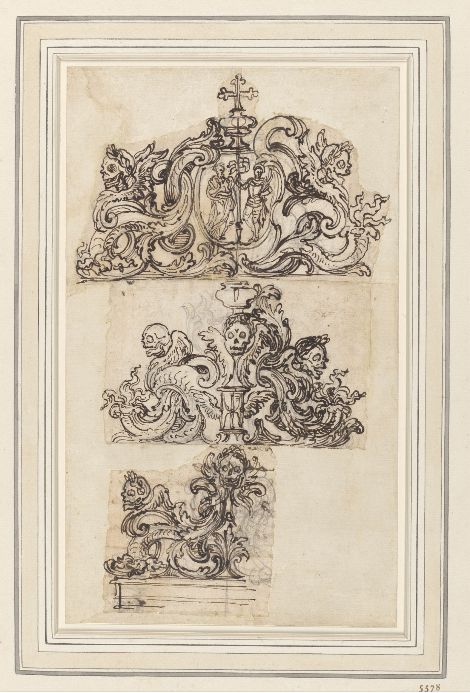 Johann Paul Schor (Giovanni Paolo Tedesco; 1615-74), three designs for the top of a frame, c.1650-74, pen-&-ink, black chalk, 31.5 x 18.7 cm., Royal Collection Trust. RCIN 905578