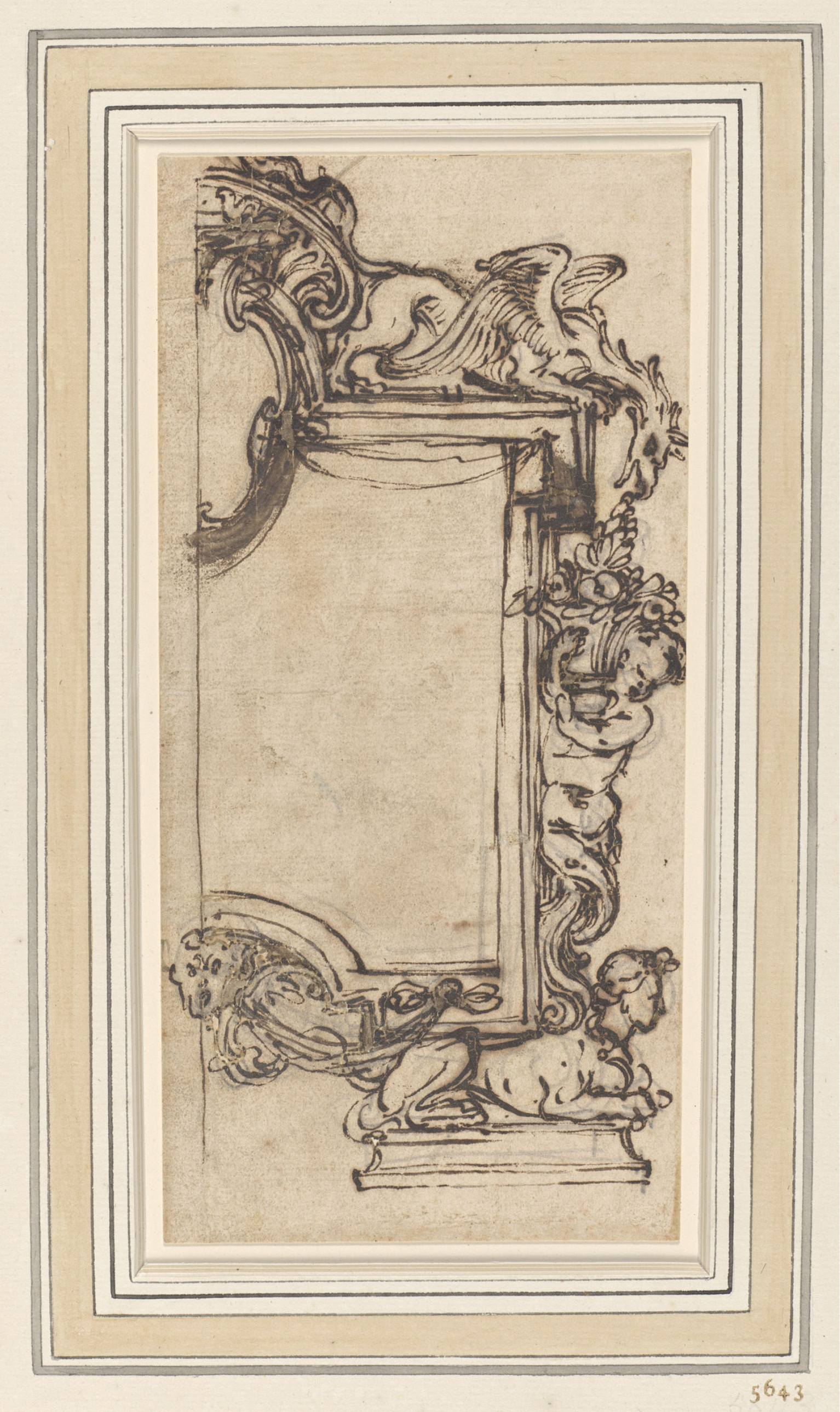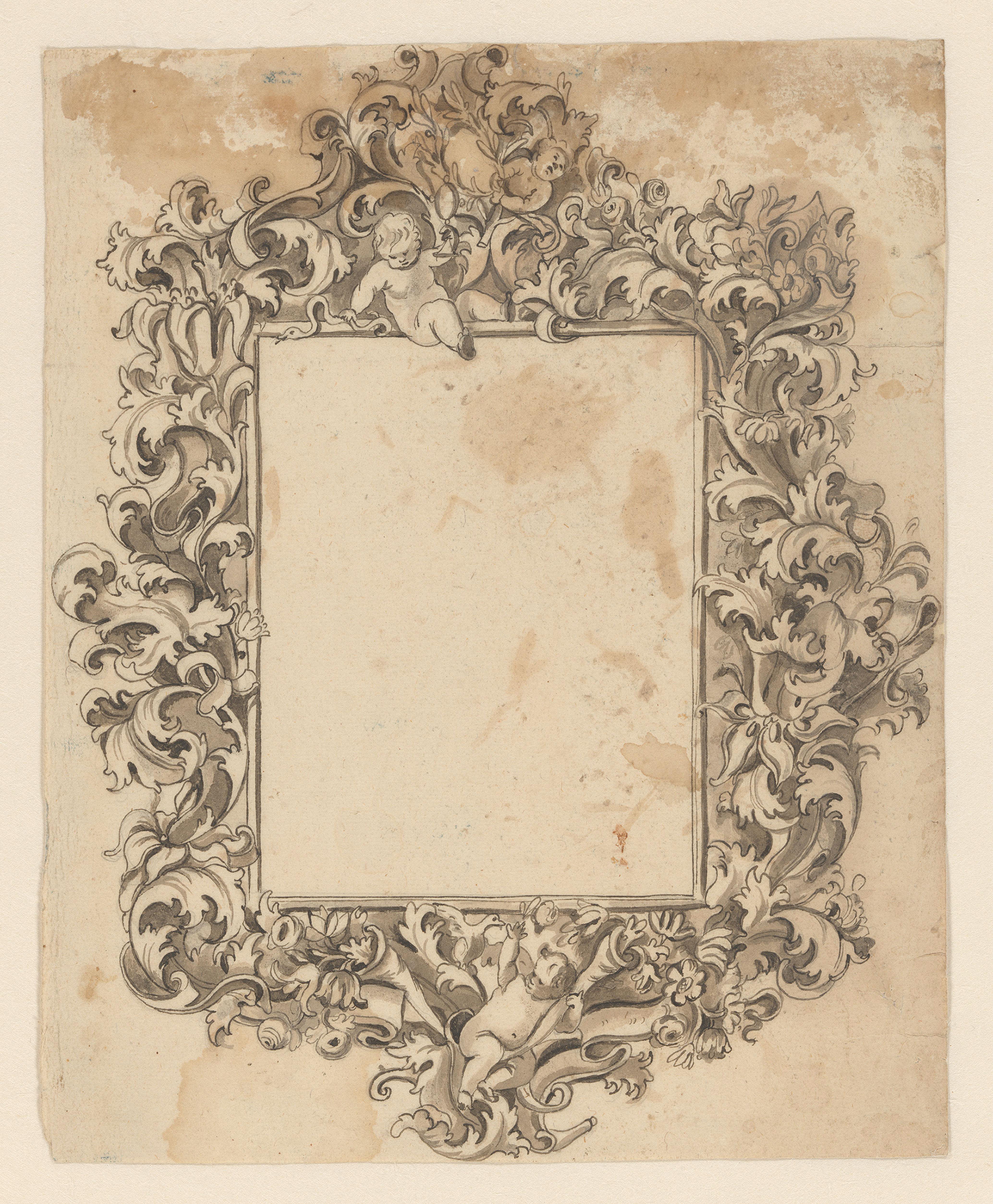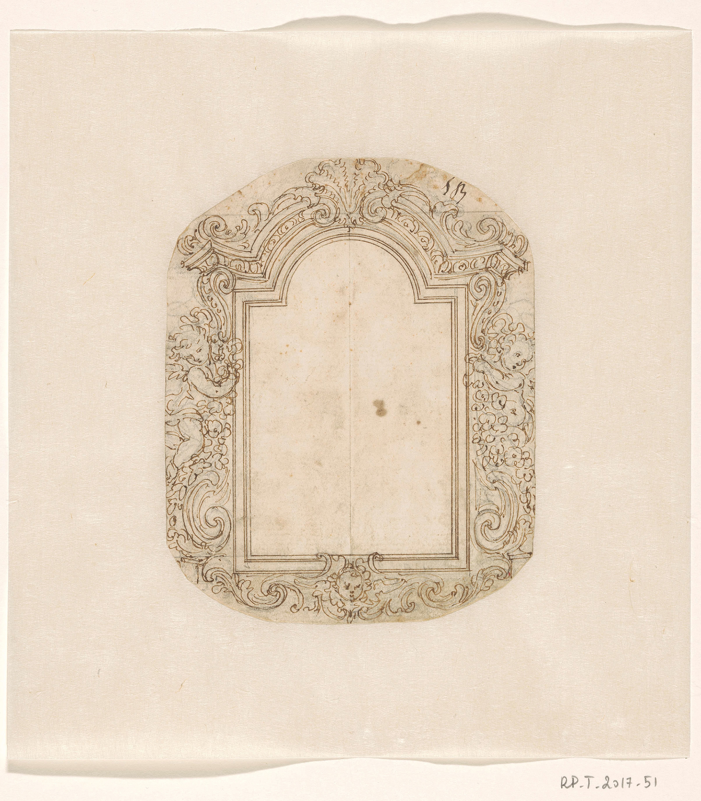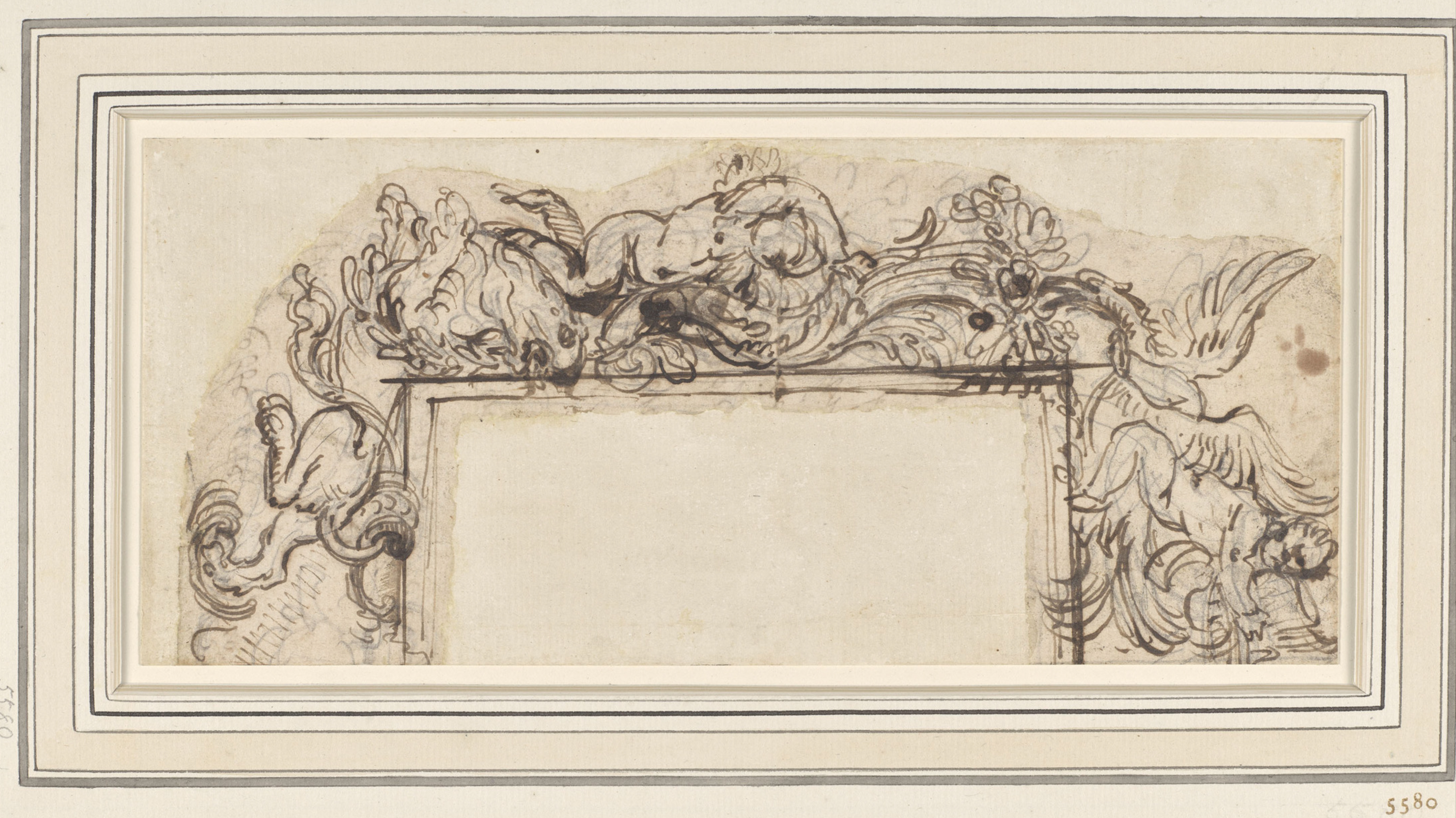 Giovanni Battista Foggini (1652-1725), design for a frame with two putti, c.1680s-1710s, pencil, pen-&-ink, 14.7 x 117 cm., Rijksmuseum