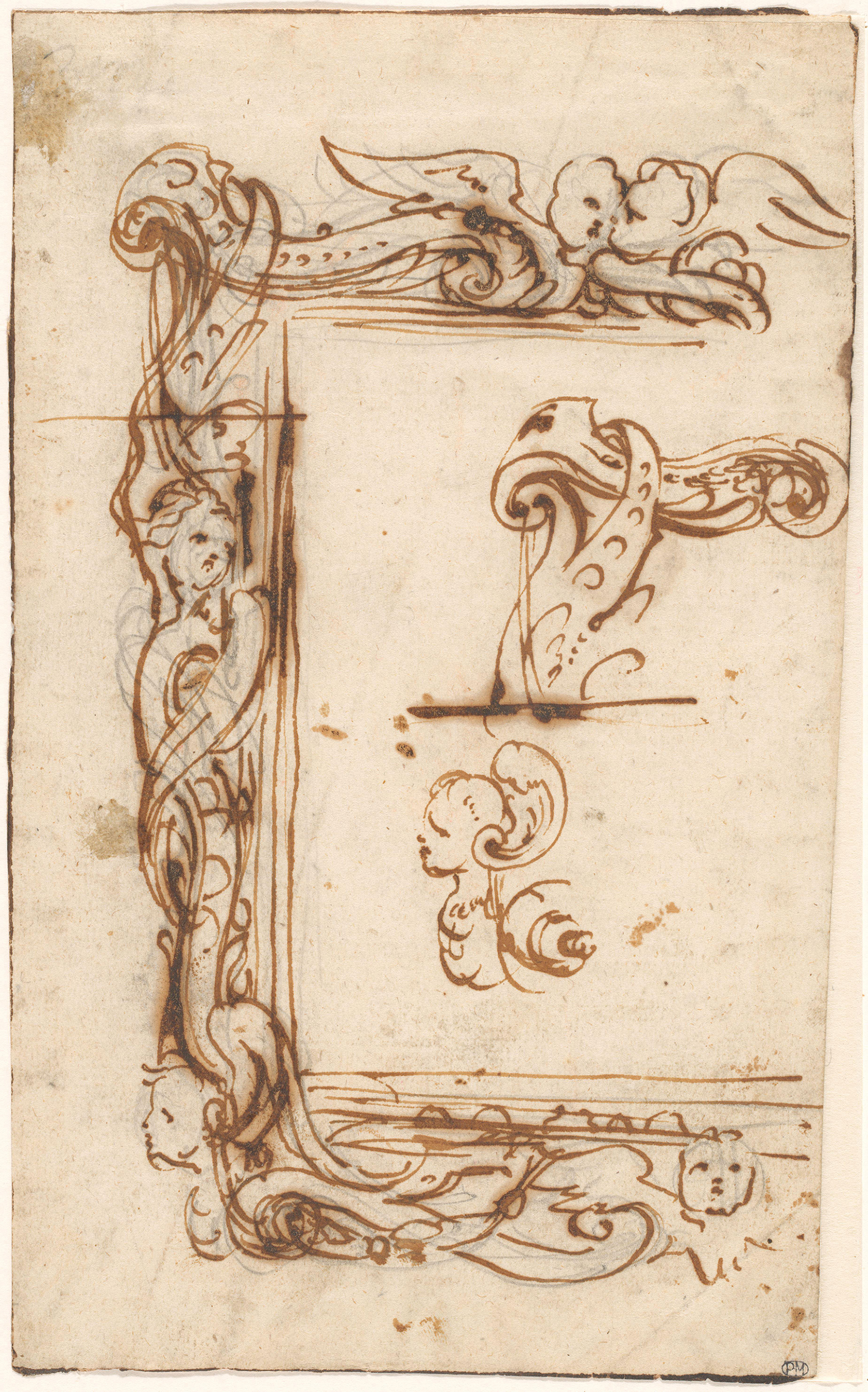 Johann Paul Schor (Giovanni Paolo Tedesco; 1615-74), design for the top of a frame, c.1650-74, pen-&-ink, black chalk, 17.3 x 23.1 cm., Royal Collection Trust. RCIN 904458