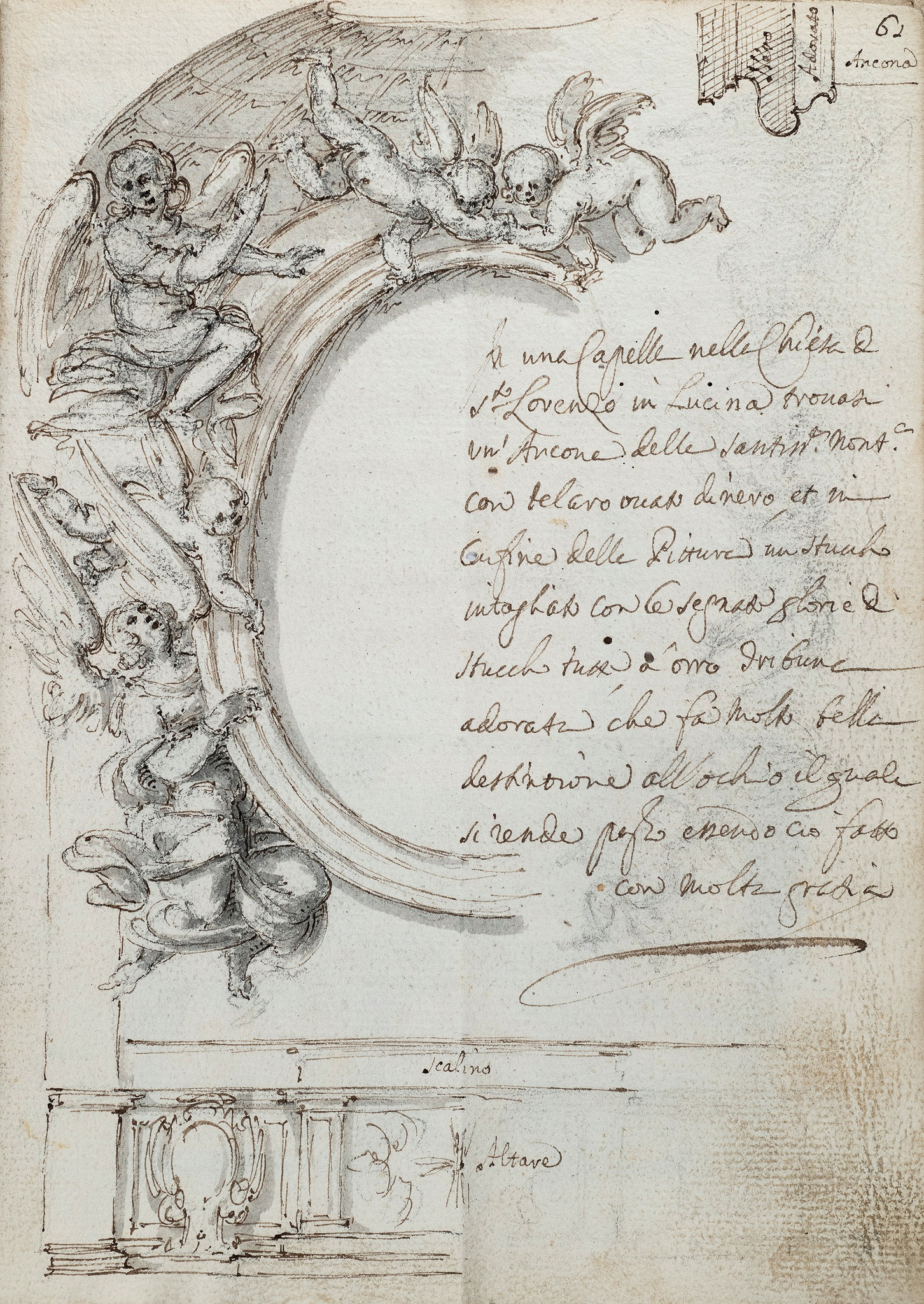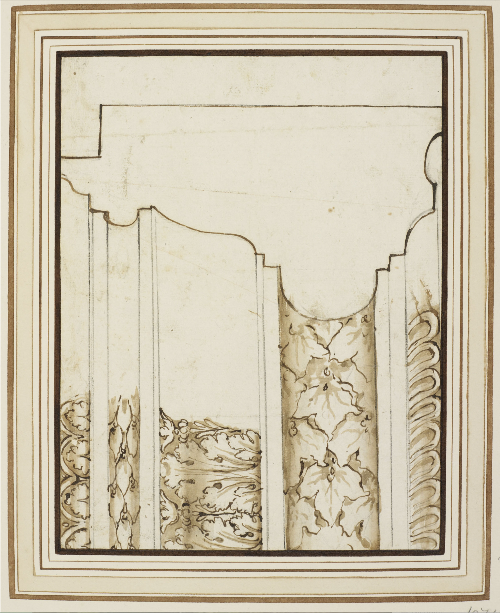 Pietro da Cortona (1596-1669), design for part of altarpiece frame, pen-&-ink, black chalk, brown wash, 18.7 x 12.3 cm., Royal Collection Trust. RCIN 904472