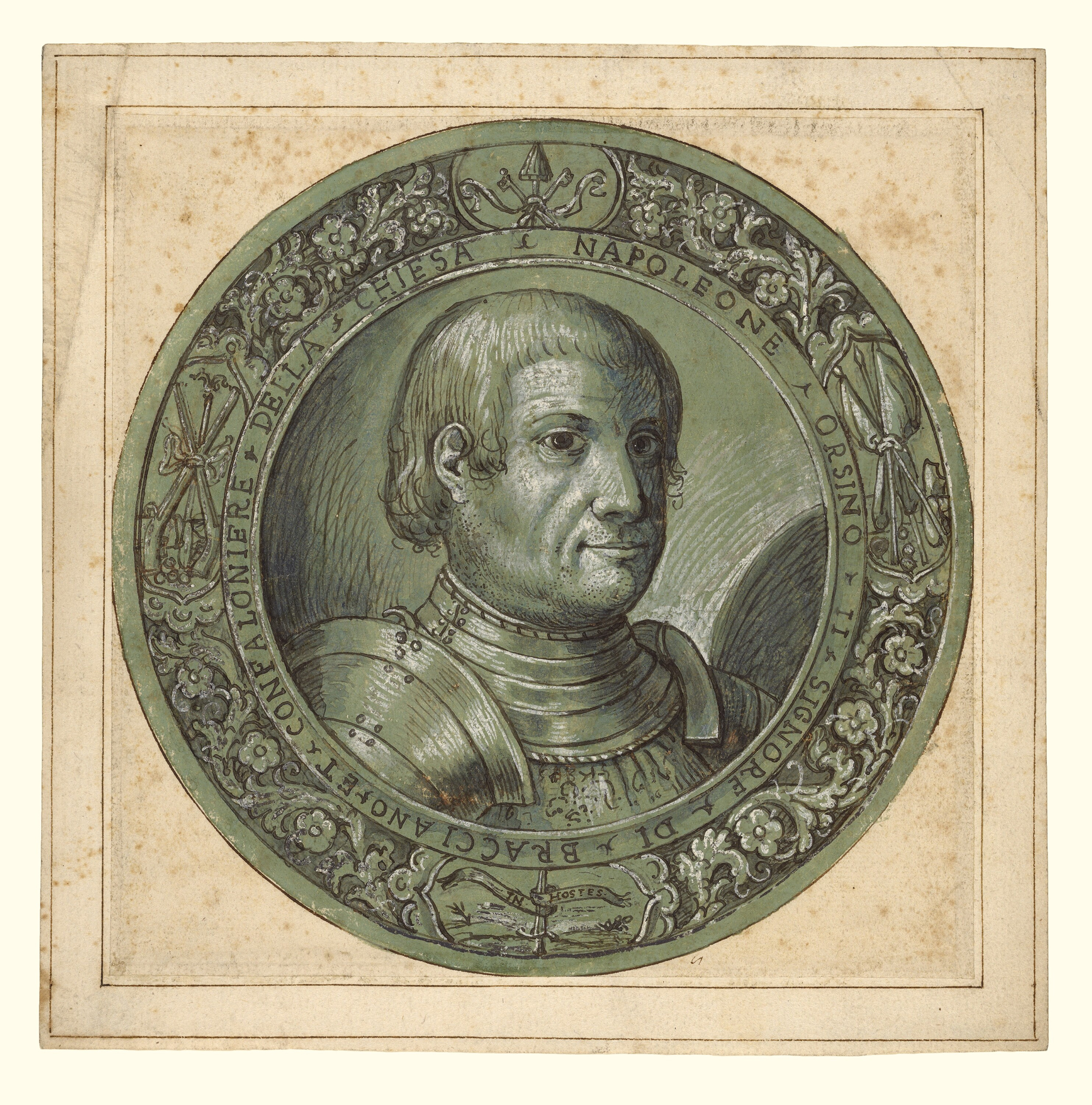 ‘A portrait of a man dressed in armour fills the centre of this tondo… He is identified by an inscription as Napoleone Orsini II, Lord of Bracciano and standard-bearer of the Catholic Church. The border is embellished with floral motifs, military trophies, the papal regalia of the crossed keys and papal crown, and the sitter’s personal motto In hostes.