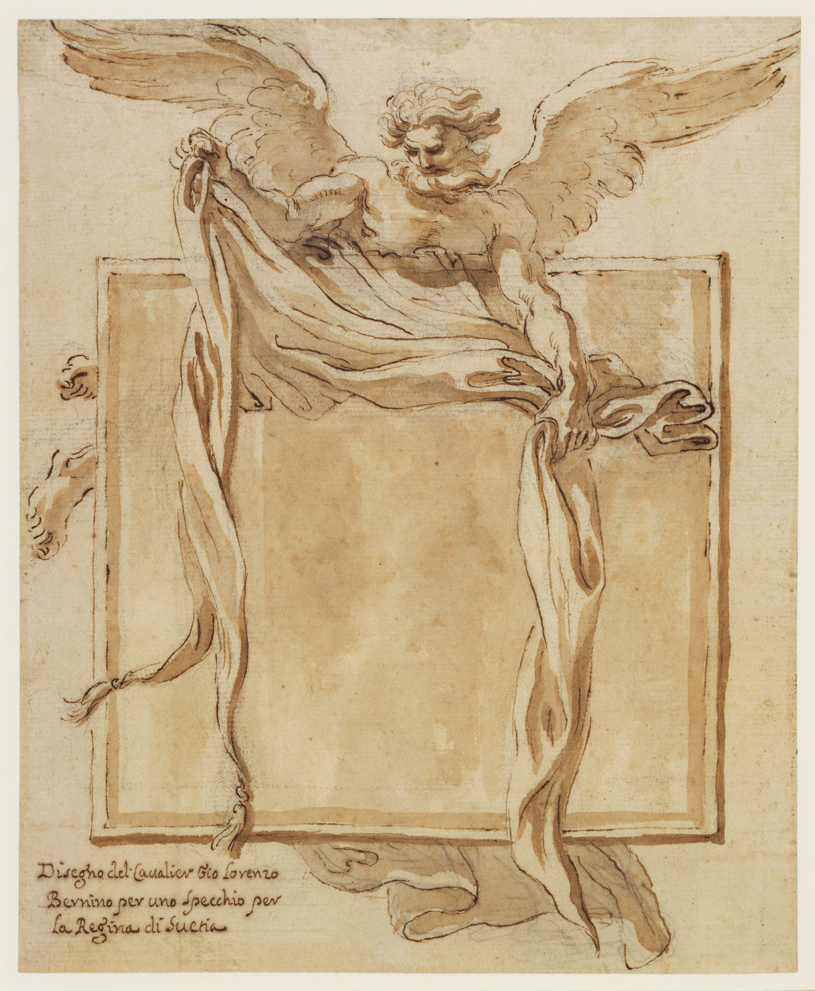 ‘A drawing of a square looking-glass with the winged figure of Chronos above, holding drapery which falls to form framing curtains within the square. Inscribed, lower left: Disegno del Cavalier Gio. Lorenzo Bernino per uno specchio per la Regina di Suetia.’