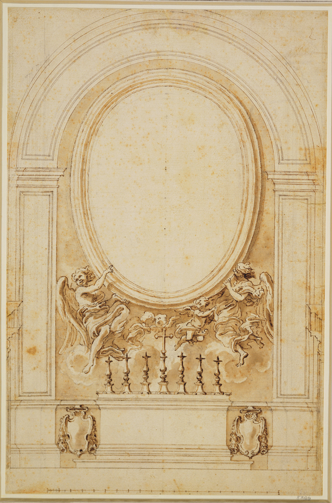 Bernini (workshop; 1598-1680), design for altar of Cappella Fonseca, S. Lorenzo in Lucina, Rome, c.1661-63, pen-&-ink, wash, black chalk, 39.9 x 26.5 cm., Royal Collection Trust. RCIN 905599