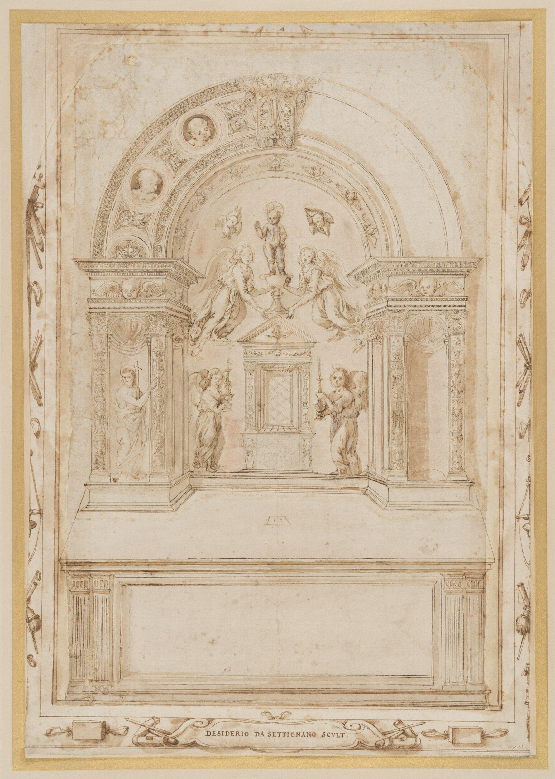 Vasari’s attribution of this particular drawing to Desiderio da Settignano must have been based on the similarity between the design and Desiderio da Settignano’s work at S.Lorenzo, Florence…