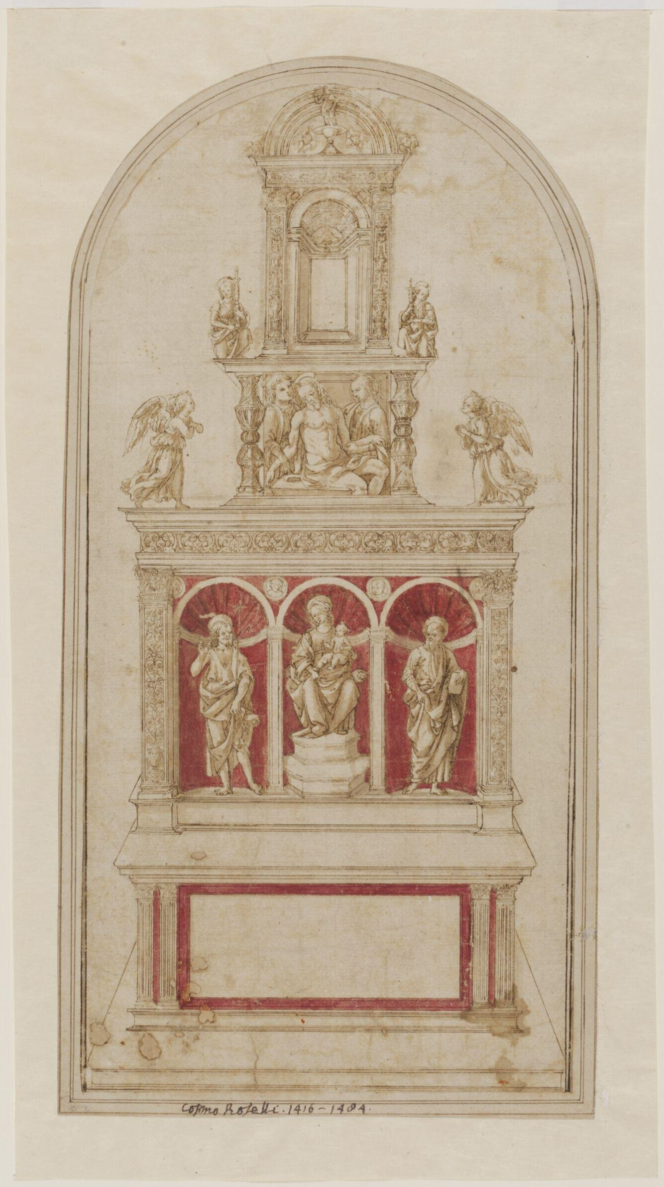 ‘Design for an altar with three niches in the retable containing sculpture, and a ciborium above. Inscribed on the mount in an old hand (probably 17th century) ‘Cosimo Roselli 1416-84’; pen and ink and wash, the niches and part of the altar-table tinted with red watercolour; the top of the sheet cut in an arch.’