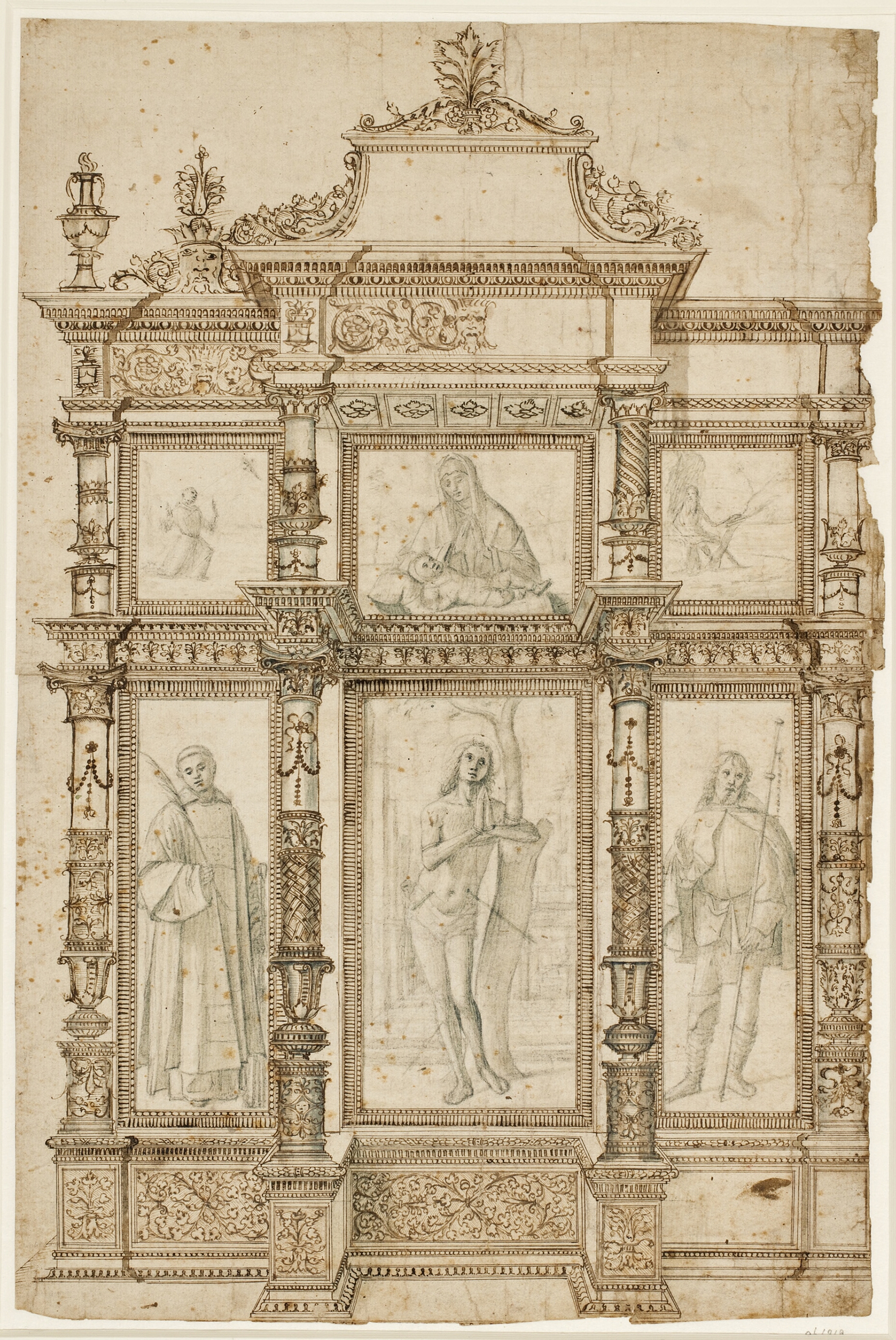Francesco di Simone Ferrucci (1437-93), design for an altar, 1480-83, pencil, ink, wash, 48.3 x 33.3 cm., V & A
