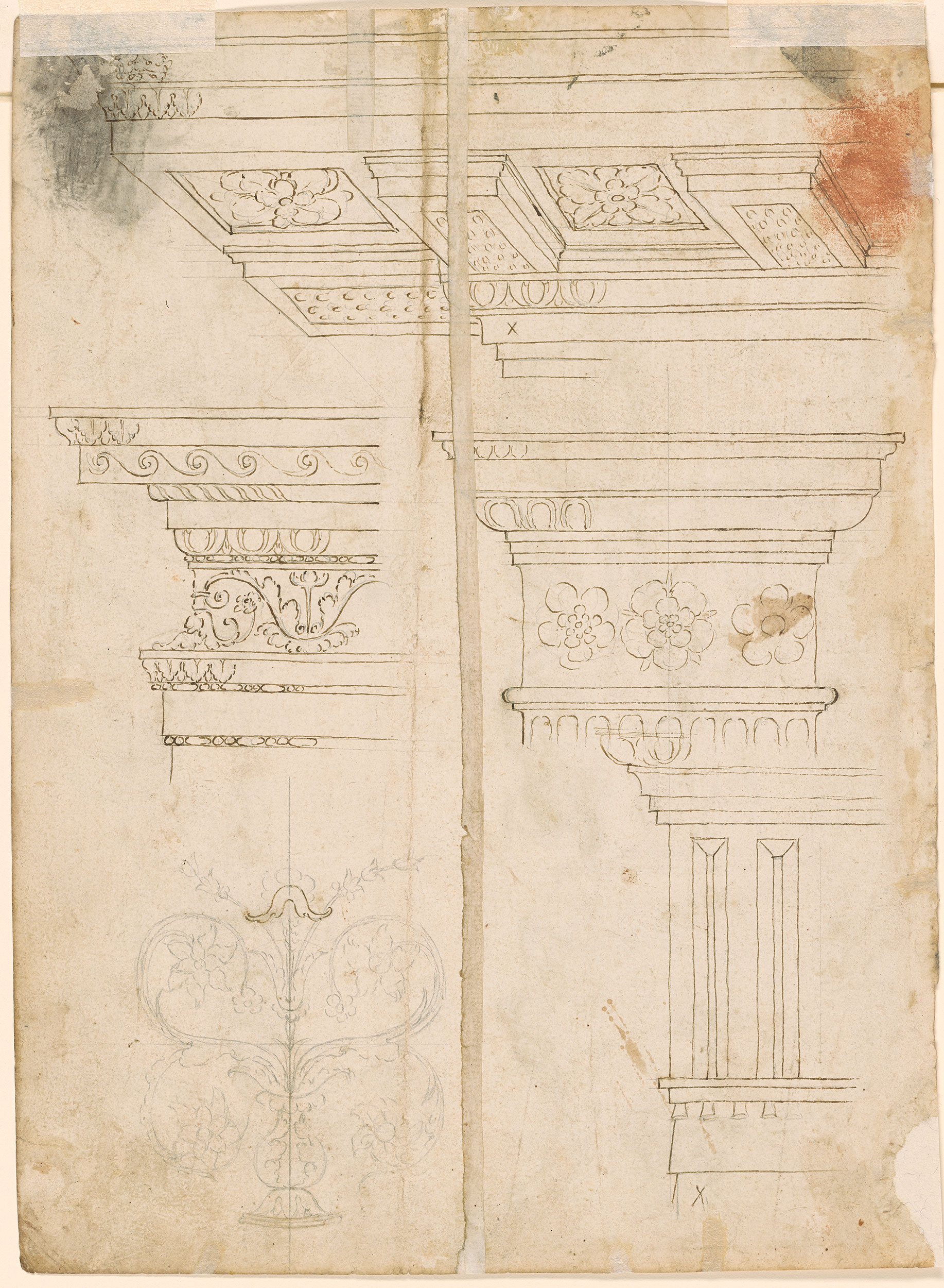Anon., 15th century Italian school, recto: grotesque designs for a pilaster ornament; verso: underview of a cornice & studies of pilasters, pen-&-ink, black chalk, 28.1 x 20.7 cm., The Morgan Library & Museum