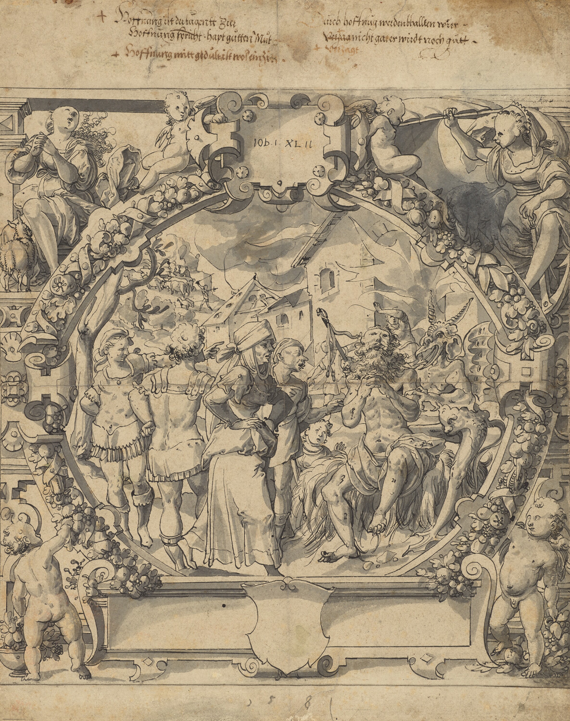 ‘Werner Kuebler the elder made this study for a stained-glass window, filling not only the circular central scene but also the surrounding frame with moralizing details. The figures of Patience, with a lamb, and Hope, with an anchor, perch on either side, references to the noble qualities which Job possessed. Lush bunches of fruit and vegetables ornament the design’.