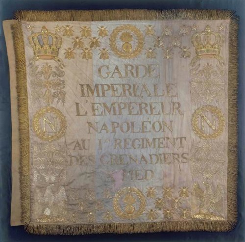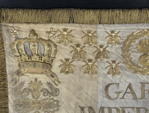 Standard of the 1st regiment of foot soldiers of the Imperial Guard, 1812, silk & gold thread, 90 x 91cm., Musée de l’Armée, Paris; & detail. Photos: RMN-Grand Palais