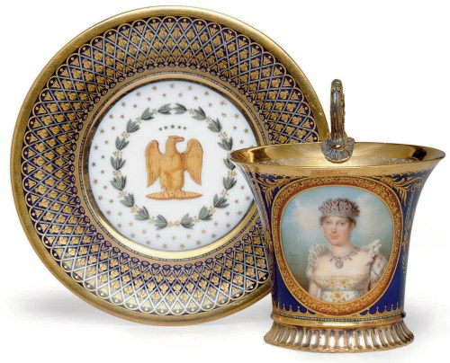 Denis Delafosse (fl. 1805-15) after Jean-Baptiste Isabey (1767-1855), Sèvres cup & saucer, Jasmin à pied cannelé: Marie-Louis, impératrice; à fond bleu de four, 1812, & detail; Sèvres, Cité de la céramique