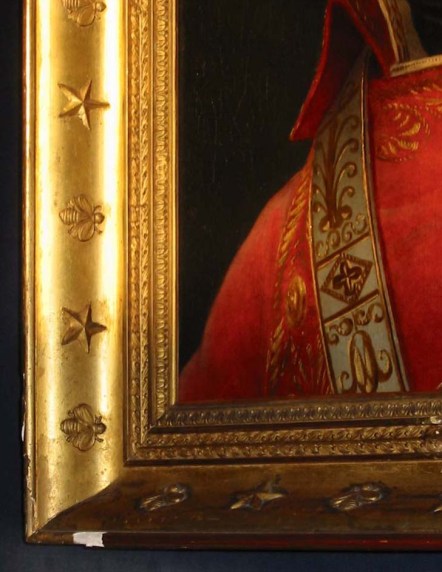 To begin with one of the earlier representations of Napoleon in a bee frame, there is a portrait of him by Joseph-Marie Vien (father or son) in the collection of Malmaison, dating from around 1803. The frame has a nice simple ogee profile, studded chastely with alternating moulded plaster stars and bees, a run of a vertebrate branch of bay leaves centred on and springing from corner rosettes, and rais-de-coeurs at the sight edge. It makes a splendid setting for the young Napoleon, in his red velvet uniform and sash embellished with palmettes and anthemia, the suitability only heightened by the echo of the rosettes in his brass buttons. Unfortunately, the Premier Consul would not have had bees as an emblematic motif on a contemporary frame; bees – as noted above – were instituted as an imperial emblem at the time of the coronation, in 1804, and did not appear publicly until December of that year. Moreover, the frame has been reduced at some point, the rosettes at the centres of the bay leaf branches now no longer aligned with the actual centres of the rails [18].