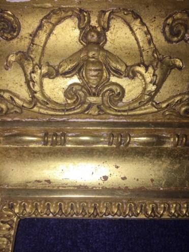 It has also been stripped back and regilded with a matte finish; so that the burnish and patina of the original finish (above) have disappeared. It may have been a frame associated with a later (and slightly larger) portrait of Napoleon, or of one of his family; sadly, its history is now almost certainly lost. The bees are short and fat, with spread double wings and wonderfully stripy bodies – an anticipation of Disney bees; the bay leaf branch is a characteristic Directoire and Empire ornament.