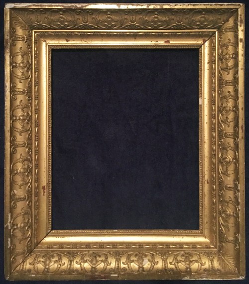 One rare example of a picture frame decorated with butterflies survives, although presumably not with its original painting, given the subject (its provenance is only traceable to 1937; the frame may have been united with the picture at any point, including by the Gallery). This pattern is more likely to have been designed for an episode of the story of Psyche, a Venus, a Hero and Leander, or perhaps the portrait of a lady of the court. It provides a sort of feminine partner to the imperial bee frame, with the butterfly held in a wreath of leaves, alternating with large urn-like flowers flourishing a central mop of stamens. The inner hollow is decorated only with a palmette at each corner. It is another instance of the migration of Napoleonic emblems onto the frame, demonstrating how central a part of the decorative and architectural interior the setting of a painting was – at least until the second half of the 20th century.